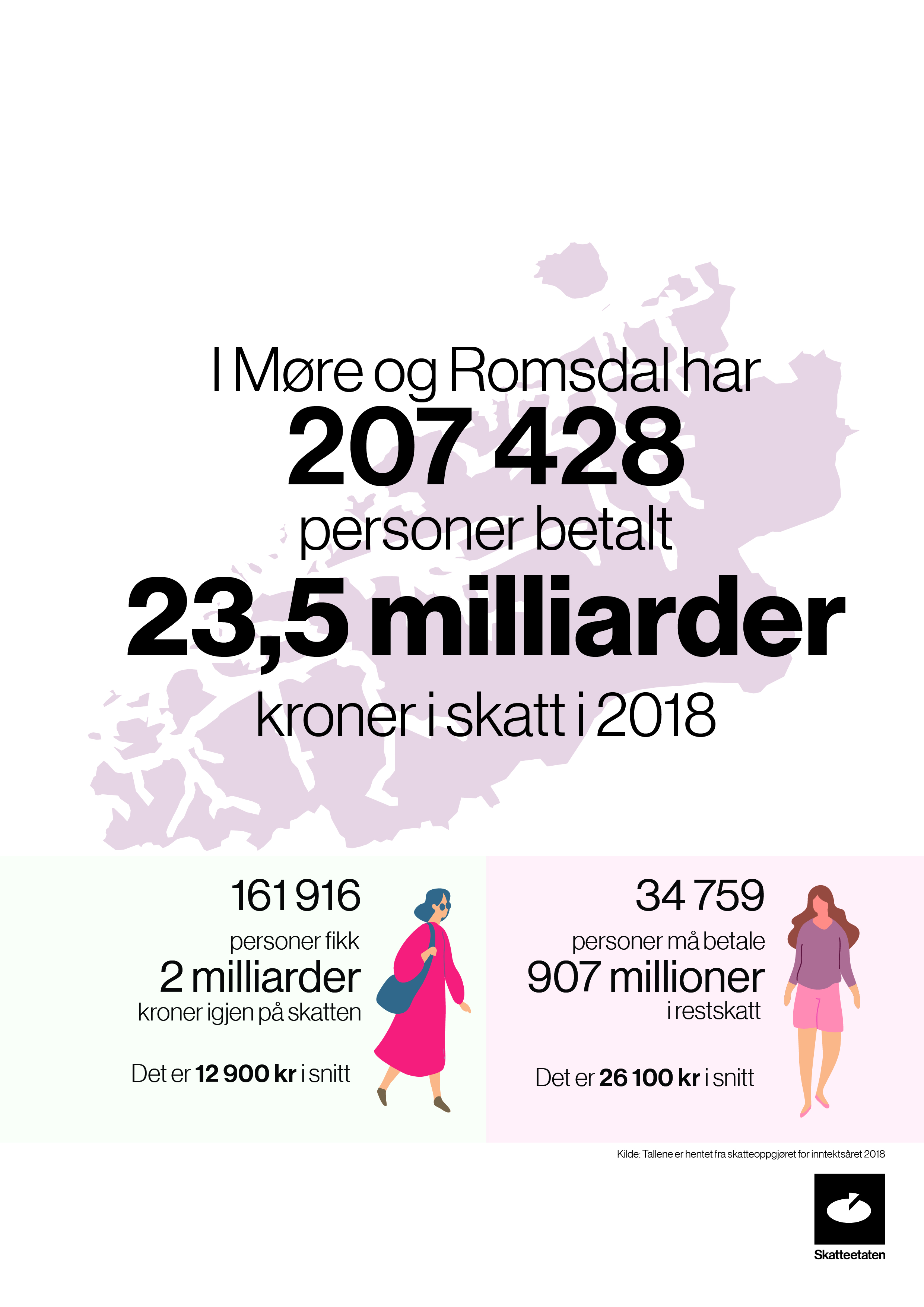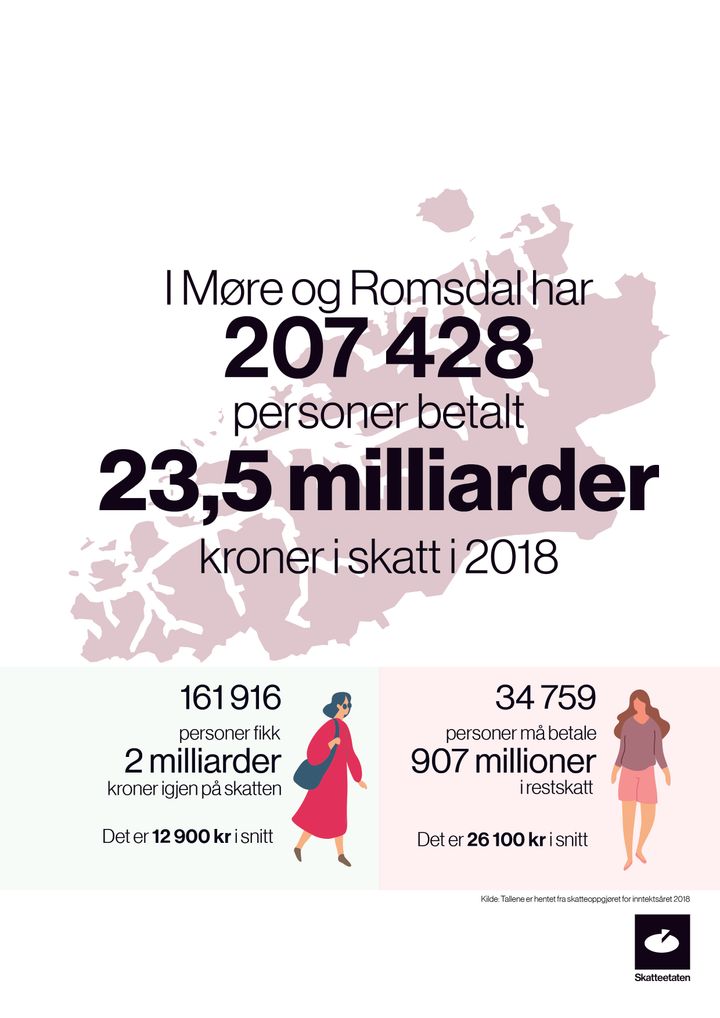 161 916 lønnstakarar, pensjonistar og personleg næringsdrivande i Møre og Romsdal fekk tilbakebetalt skatt på til saman 2 milliardar kroner i skatteoppgjeret i år. 34 759 betalte restskatt på til saman 907 millionar kroner. For dei som fekk skatt til gode var snittbeløpet 12 898 kroner, mens snittbeløpet for dei som fekk restskatt var 26 103 kroner.