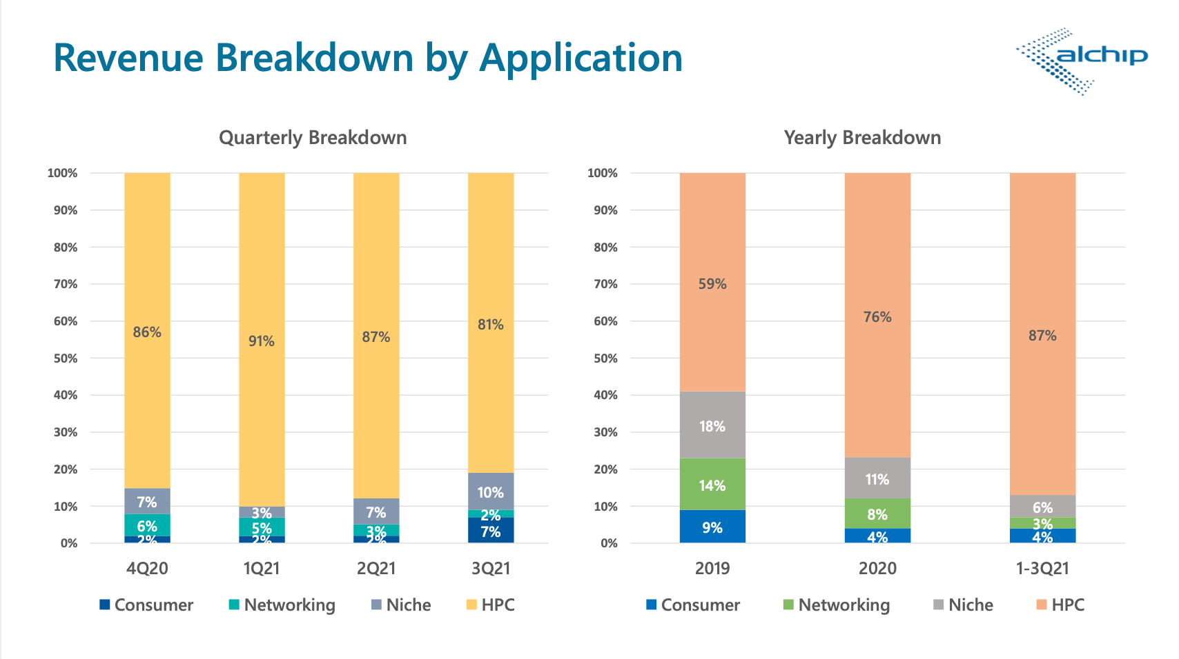 High-performance computing and niche applications accounted for 91% of Alchip’s third-quarter revenue and 93% of overall 2021 revenue to date.  Designs for 7nm+ process technology accounted for 44% of revenue for the third quarter and 60% of year-to-date revenue.  Designs targeting 12/16nm process technologies accounted for 42% of third-quarter revenue and 29% of revenue year-to-date.