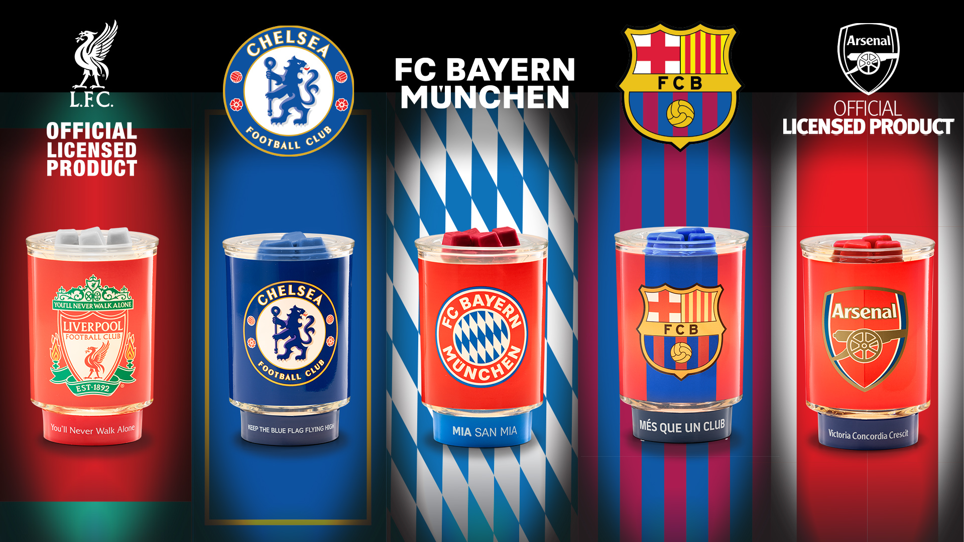 Meridian, Idaho, USA — Scentsy is excited to team up with five European soccer clubs on new wickless candles and wax warmers celebrating Arsenal FC, Chelsea FC, FC Barcelona, FC Bayern München and Liverpool FC. Scentsy, an international fragrance and home décor company, has worked with many well-known brands on officially licensed products, and these football clubs are often requested from Independent Scentsy Consultants and customers in Europe.