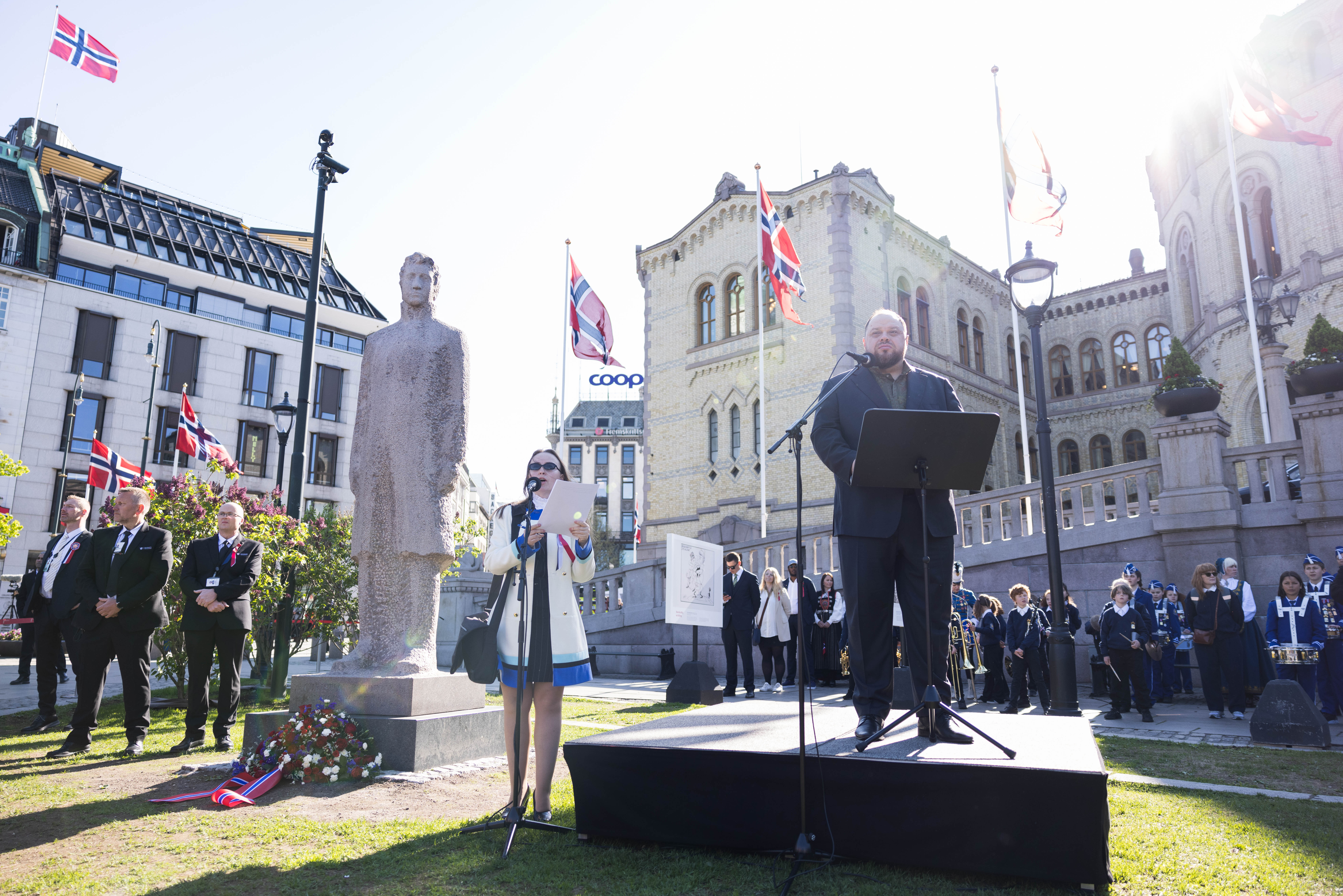 Stortingspresident Masud Gharahkhani henvendte seg direkte til den ukrainske parlamentspresidenten da han holdt tale og la ned krans ved Christian Frederik-statuen på morgenen 17. mai.