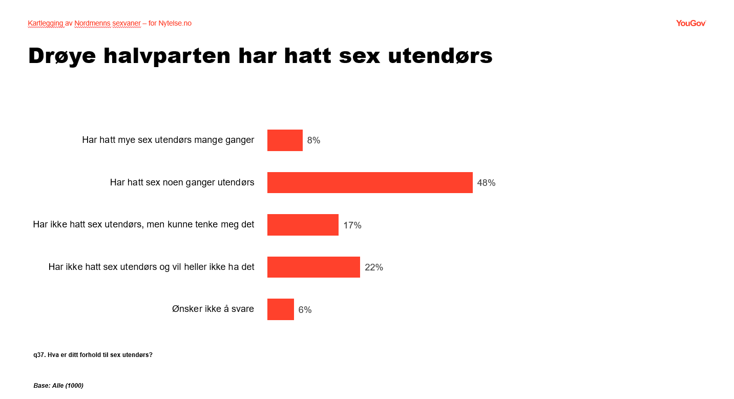 Utendørs sex i det offentlig er høyt på listen over seksuelle fantasier, og i en ny undersøkelse gjennomført av YouGov for Nytelse.no kommer det frem at hele 54% har hatt sex i det fri. Av disse vil flest ha sex i skogen, mens stranda og fjellet kommer hakk i hel på listen.