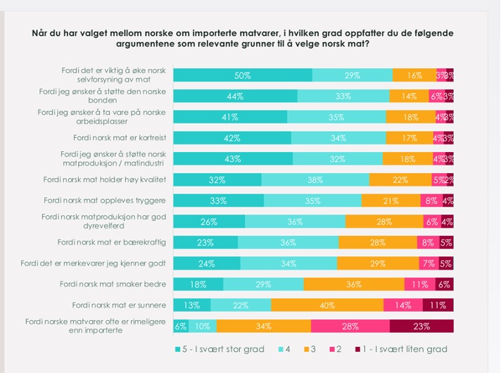 Høy prioritering av selvforsyning: 79 % av respondentene anser selvforsyning som den viktigste grunnen til å velge norsk mat over importert mat. Dette inkluderer 50% som er enige i svært stor grad, og 29% i stor grad.