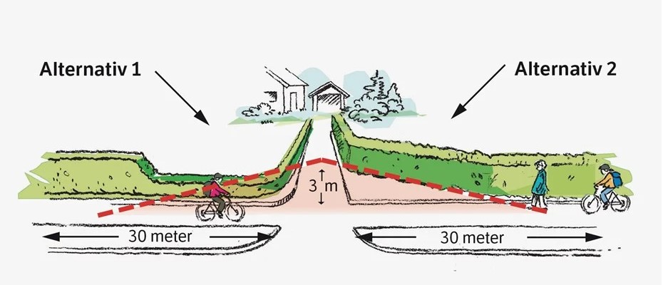 Det må være 3 meter fri sikt inn i avkjørselen. Det betyr at når du står 3 meter inn i avkjørselen din, skal du kunne se midten på gang- og sykkelveien 30 meter til hver side. Merk at frisiktsonen bør være over 30 meter hvis gang- og sykkelveien heller og syklistene holder høy fart.