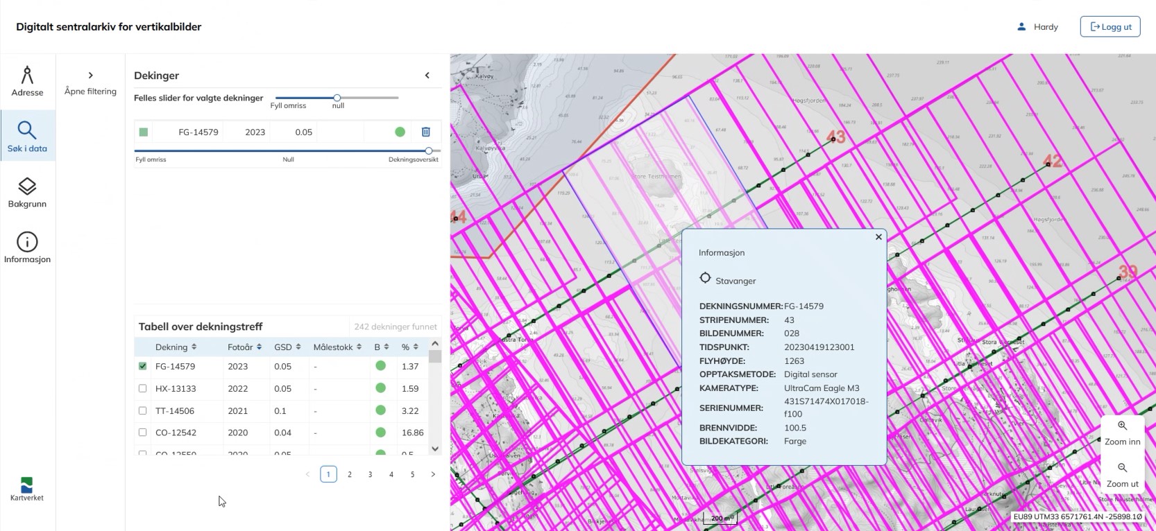 Søkeverktøyet gir informasjon om kva slags enkeltbilde som dekker eigedommar, plassering og eigenskapar – og inneheld metadata som dato, målestokk eller detaljgrad (gsd), id til flyfotoprosjekt (dekningsnummer), om bildet er digitalt eller analogt.