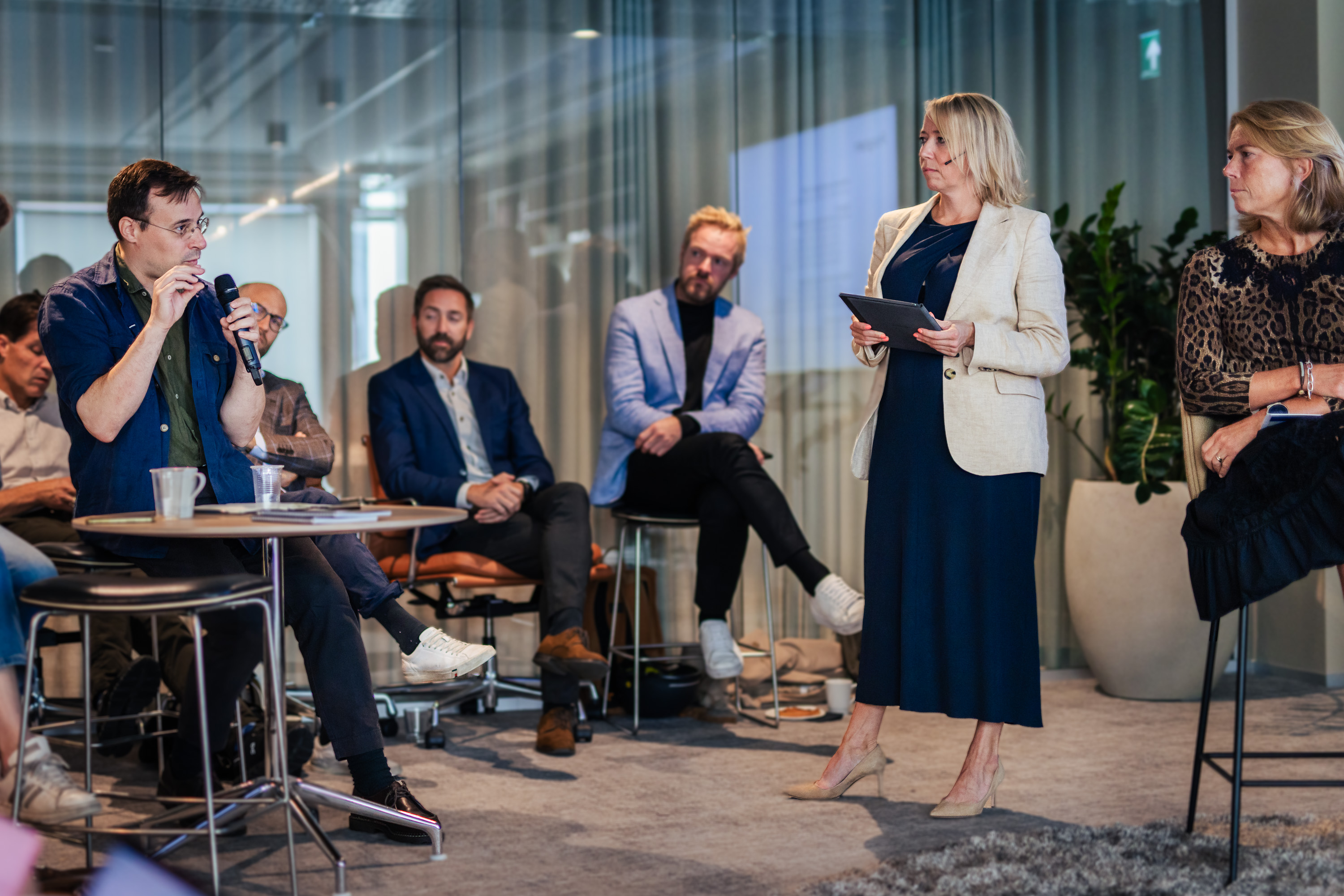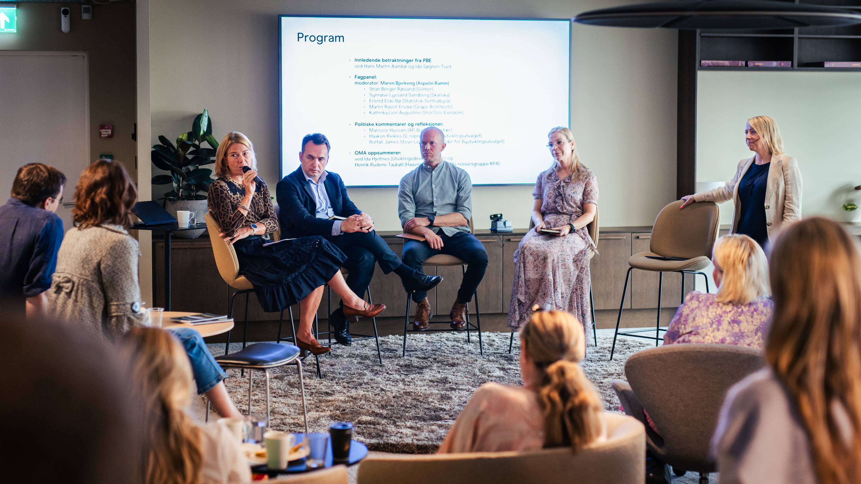Plan og bygningsetatens enhetsleder for plan og analyse, Hans Martin Aambø, innledet med bakgrunnen for planforslaget, før et panel på fire delte sine synspunkter: Stian Berger Røsland (Selmer), Synnøve Lyssand Sandberg (Skanska Næringseiendom), Martin Rasch Ersdal (Grape) og Kathinka Lien Augustine (Stor-Oslo Eiendom).