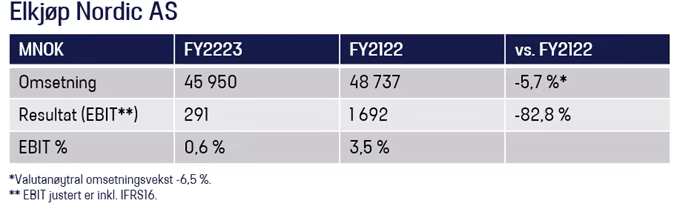 Elkjøp Nordic har avvikende regnskapsår og resultatene er fra mai 2022 til april 2023.