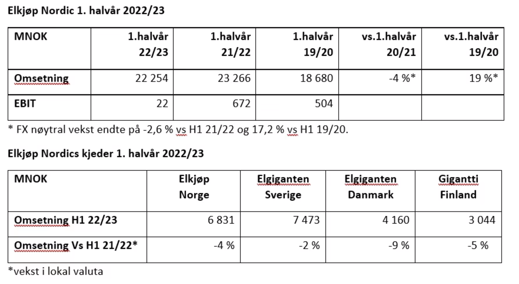 Samtlige markeder har også omsetningsnedgang, minst nedgang i våre to største markeder i Norge og Sverige med henholdsvis 4 og 2%. Resultatet ender på 22 millioner, mot 672 millioner samme periode i fjor. For nærmere presentasjon av resultatene, se tabellene under.