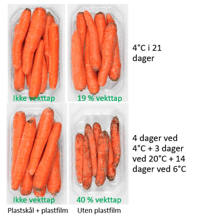 For eksempel gulrøtter tørker og skrumper fort inn i romtemperatur, og særlig hvis de ikke er pakket i plast. Nofima-forskerne lagret flere pakker med gulrøtter under ulike betingelser i 21 dager.