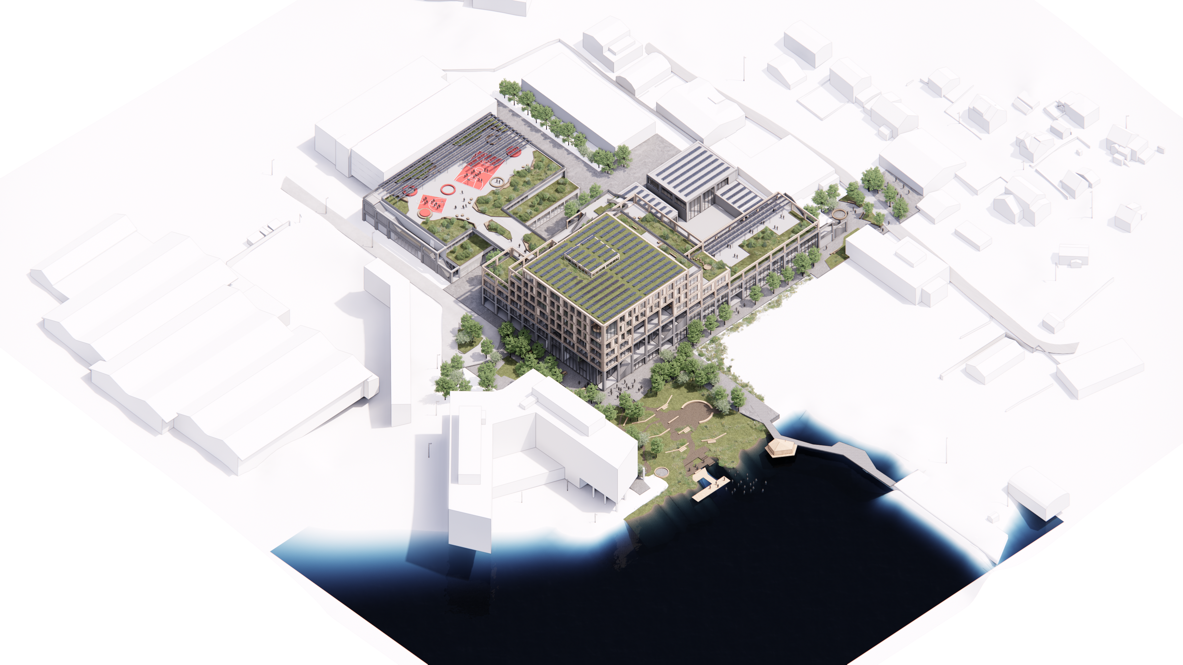 I den mørke årstiden opplyses havnen av gløden fra aktivitetene på bakkeplan, verkstedene, hjerterommet og det øverste nordlysobservatoriet. På dagtid vil byrommene og takflatene omkring skolen yre av liv og aktivitet. Den nye videregående skolen i Harstad er en viktig del av revitaliseringen av det før så aktive havneområdet og bidrar til den positive utviklingen av den nye bydelen.