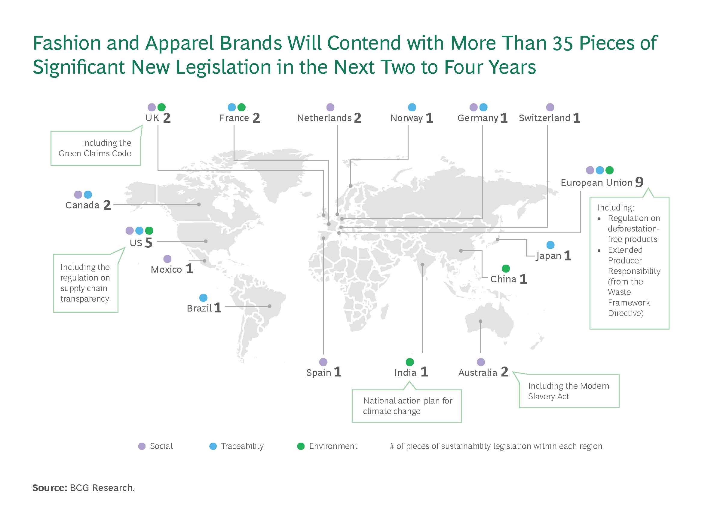 I løpet av de neste 2-4 årene forventes mer enn 35 nye bærekraftsrelaterte reguleringer å tre i kraft rundt om i verden, rettet mot importrestriksjoner, retningslinjer for produktdesign, merkingskrav med mer.