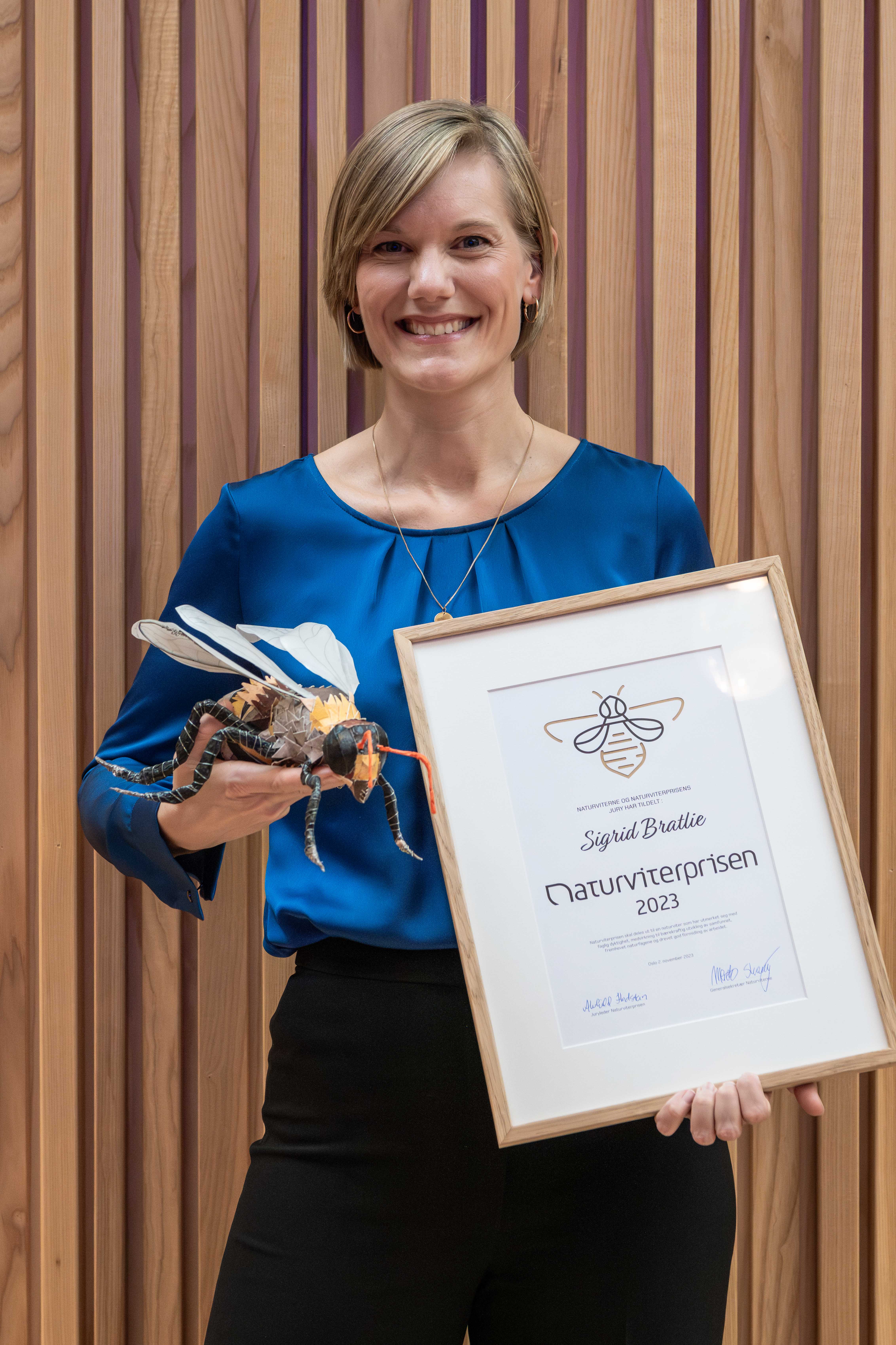 Sigrid Bratlie fikk overrakt Naturviterprisen 2023 på årets Naturviterforum. Hun tildeles prisen for sitt arbeid med å spre kunnskap og skape offentlig debatt om hvordan genteknologi kan brukes i medisin- og matproduksjon.