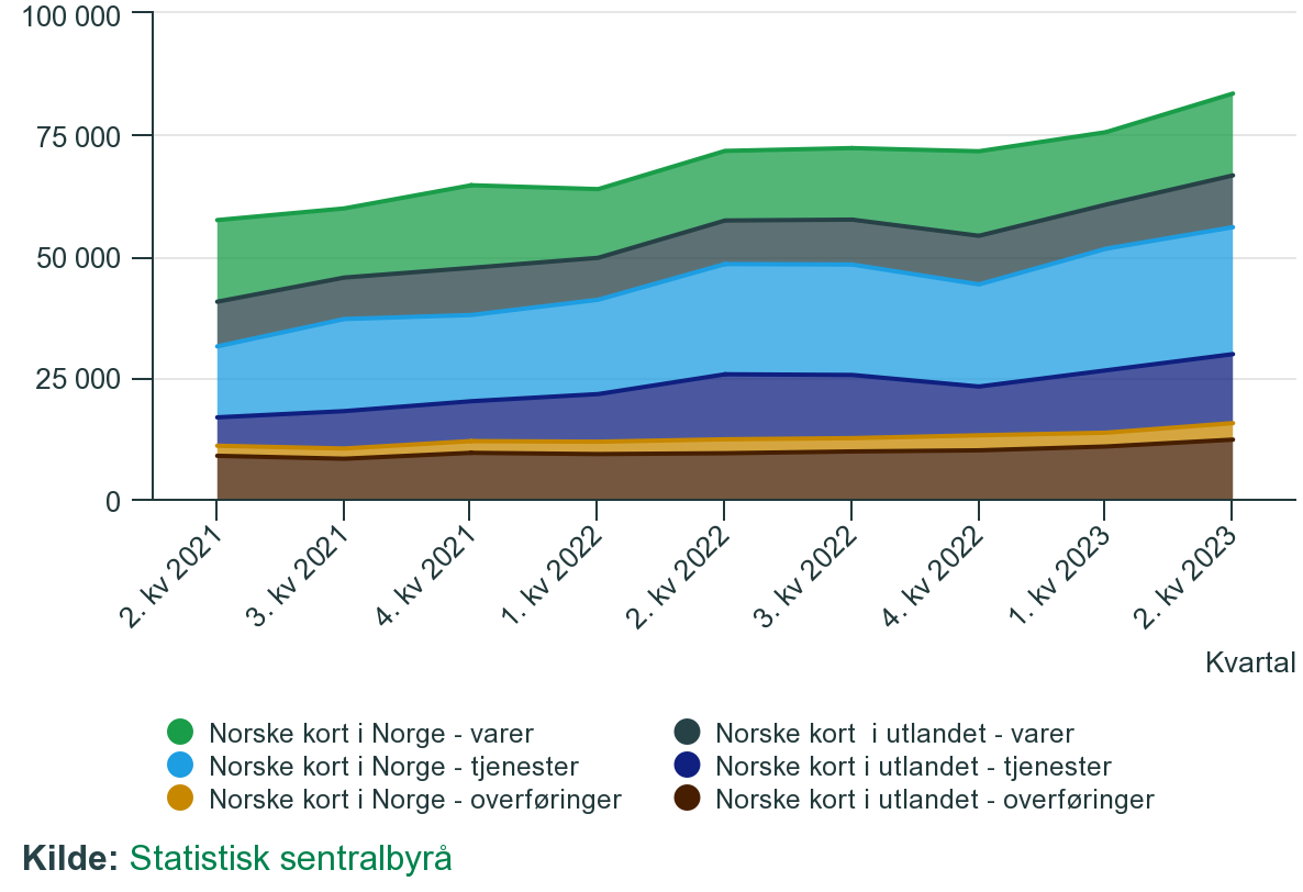 Dette er i tråd med funnene fra andre kvartal fra Statistisk Sentralbyrå (SSB). Under overskriften Veksten i netthandelen avtar skriver SSB at det «[e]tter flere år med kraftig oppgang i nordmenns netthandel med internasjonale betalingskort, har veksten avtatt noe. Omsetningen med norske internasjonale betalingskort over internett var 15 prosent høyere i 2. kvartal 2023 enn i samme kvartal i fjor, mot henholdsvis 40 og 25 prosent i de samme kvartalene for periodene 2020-2021 og 2021-2022».