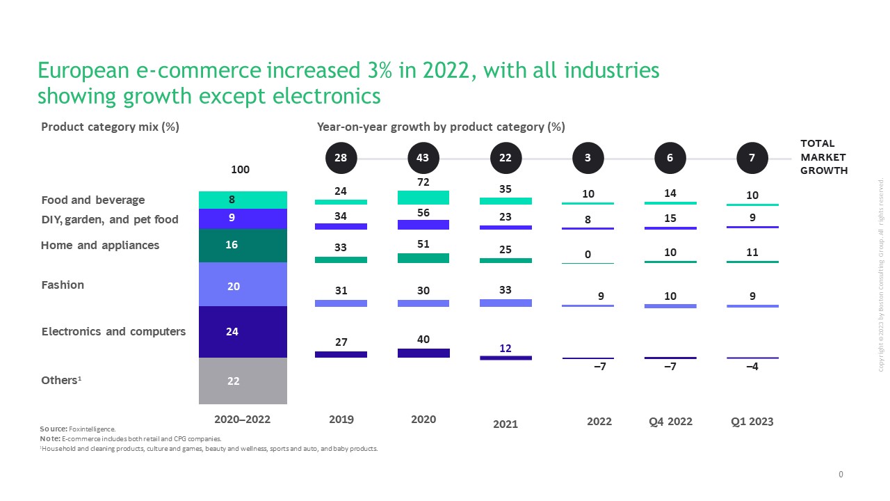 Ifølge den ferske studien Winning Formulas for E-Commerce Growth økte e-handelssalget med 3 % i Europa og 7 % i både USA og Asia i 2022. Det er kun elektronikk europeere har handlet mindre av på nett i 2022 enn tidligere år.
