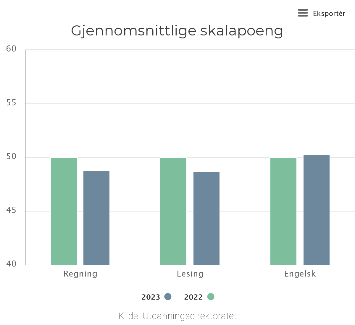 I 2022 ble innholdet i de nasjonale prøvene endret for å gjenspeile de nye læreplanene. Udir startet samtidig måling av utvikling over tid på nytt. Det vil si at resultatene fra 2022 og 2023 kan ikke direkte sammenlignes med tidligere år. Fra 2023 benyttes en ny metode for å måle utvikling over tid. Den nye metoden vil fange opp mindre endringer på et tidligere tidspunkt og vi forventer å se noe større variasjon i nasjonalt gjennomsnitt framover enn tidligere. For å kunne vurdere om endringer mellom år er et uttrykk for en trend, trenger vi resultater fra minimum tre år.