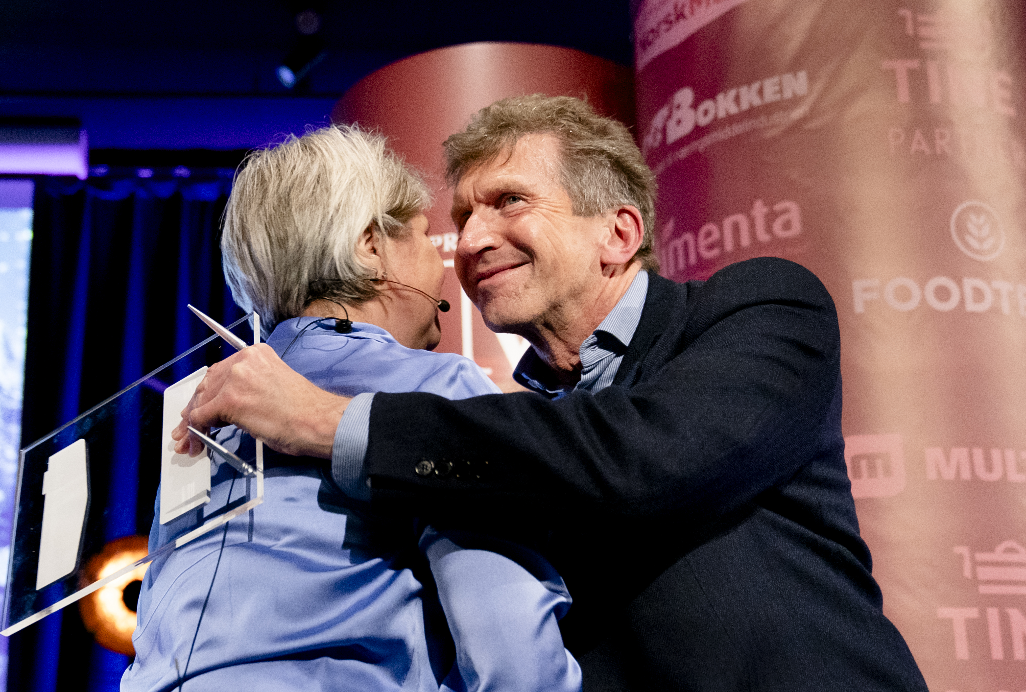 Adm. dir i Stiftelsen Norsk Mat Nina Sundqvist overrasket avtroppende adm. dir. i Animalia Tor Arne Ruud med Stiftelsen Norsk Mats hederspris under NM i kjøttprodukter.  Foto: John T. Pedersen