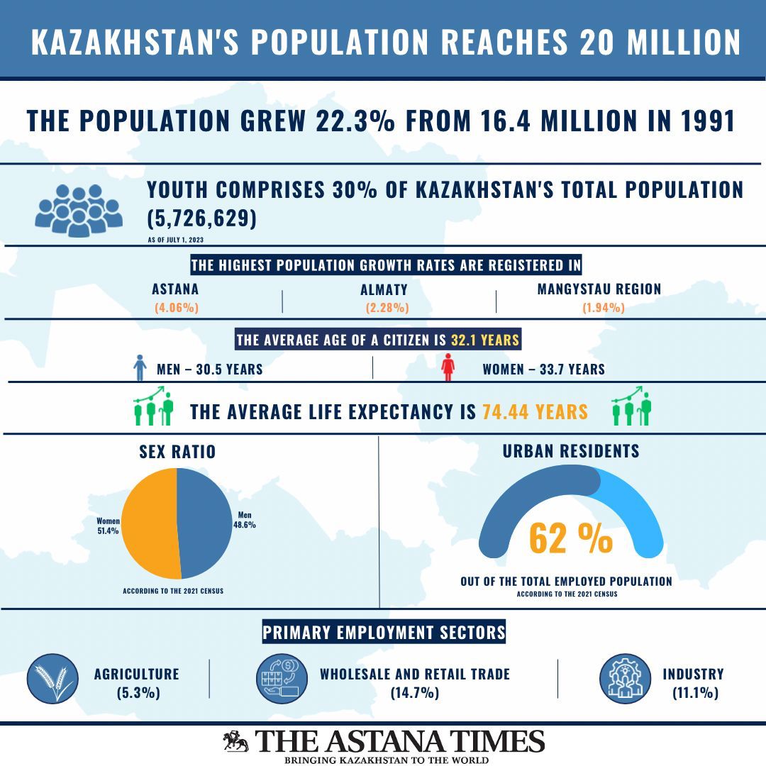 Befolkningen i Kasakhstan passerte 20 millioner 14. november 2023 ifølge Kasakhstans statistiske byrå.