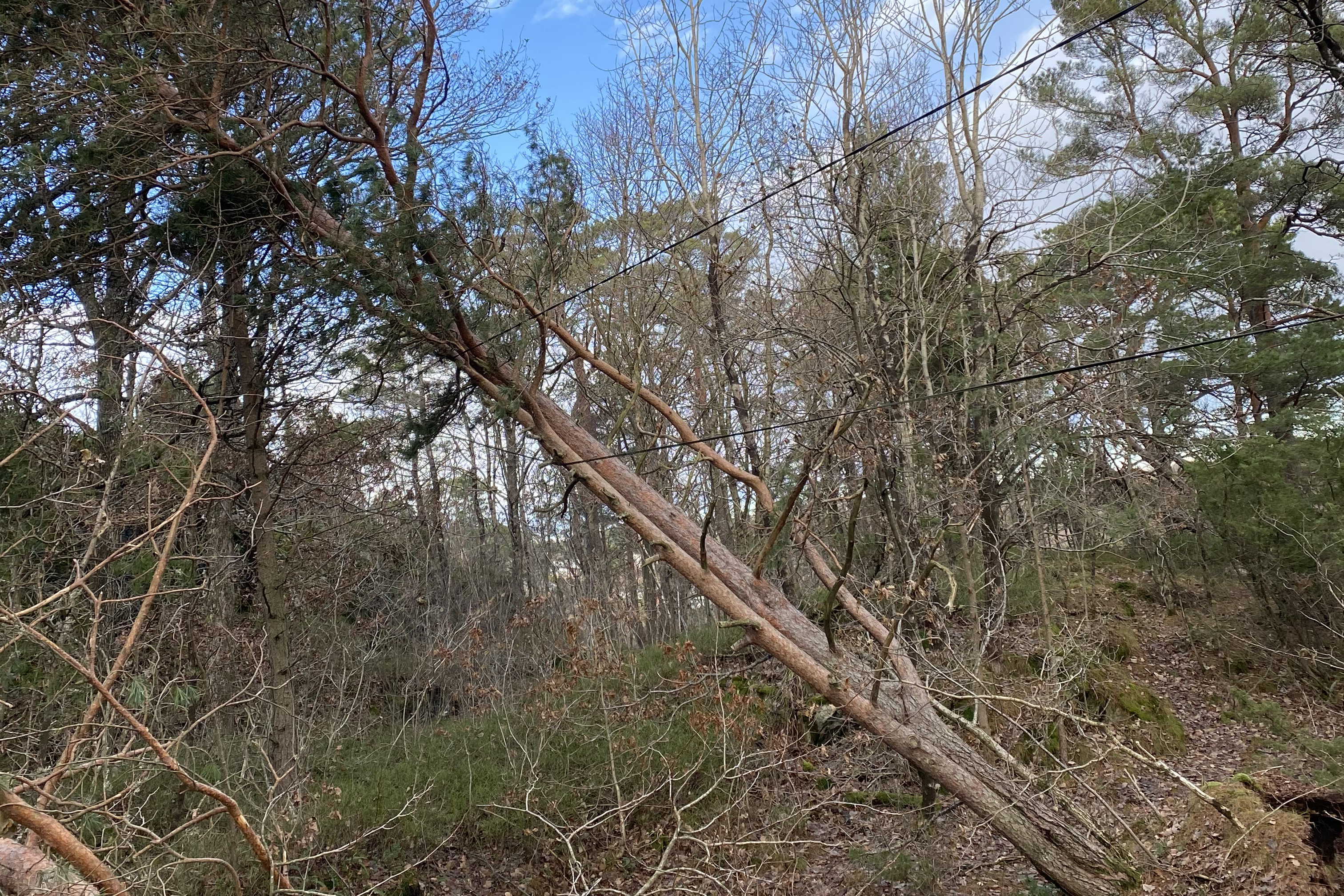 Flere steder er det rotvelt av store trær som ligger inntil lavspentlinjene, og her må en være svært forsiktig når trærne skal fjernes.