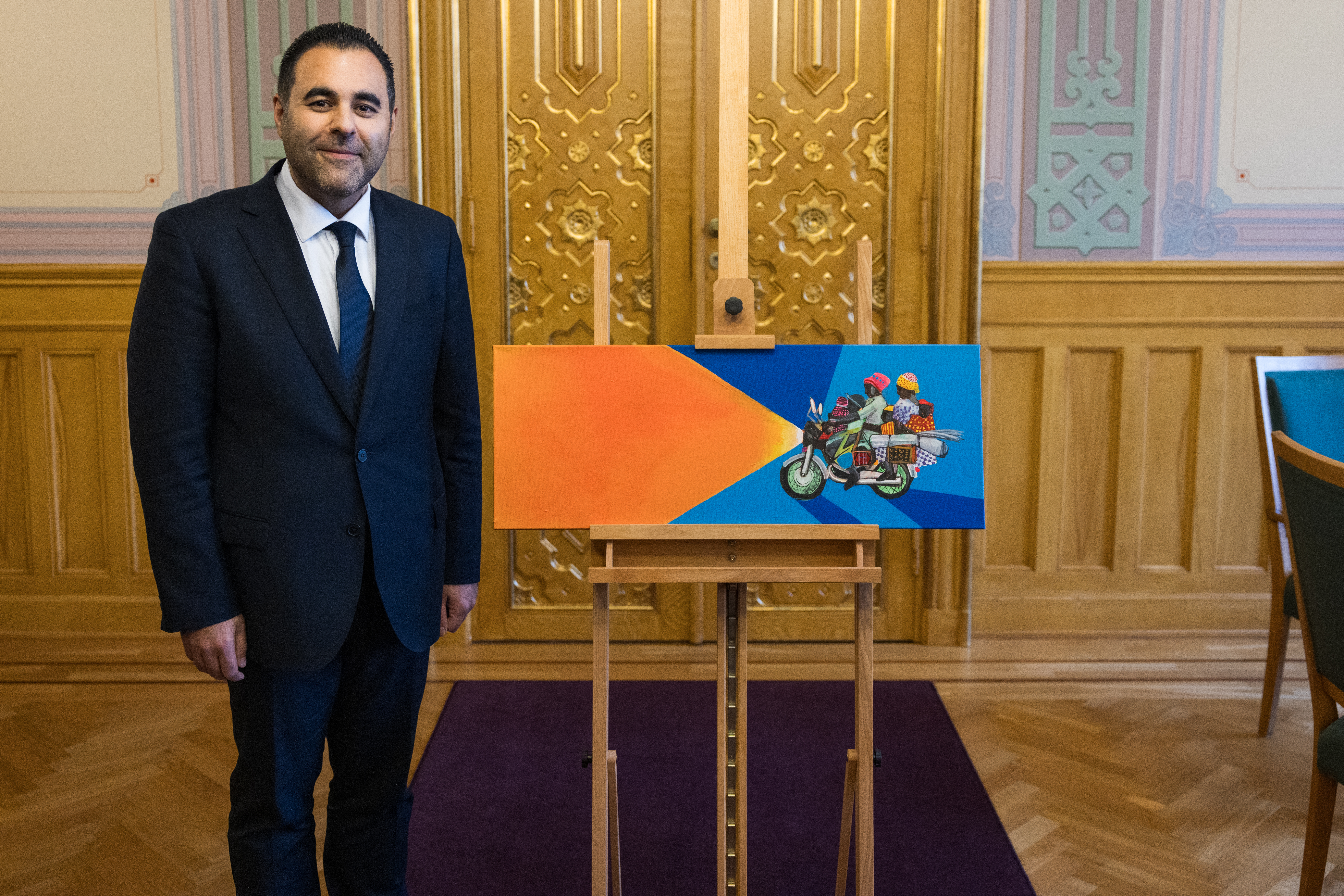 – Prinsen har vokst opp i en familie med flere kunstnere, og han har en bestemor som fortsatt er aktiv kunstner. Derfor tenkte vi det ville være hyggelig å gi Prinsen kunst. Flere kunsteksperter pekte på kunstneren Fadlabi. Han er opprinnelig fra Sudan, men har bodd og arbeidet i Oslo i 20 år.