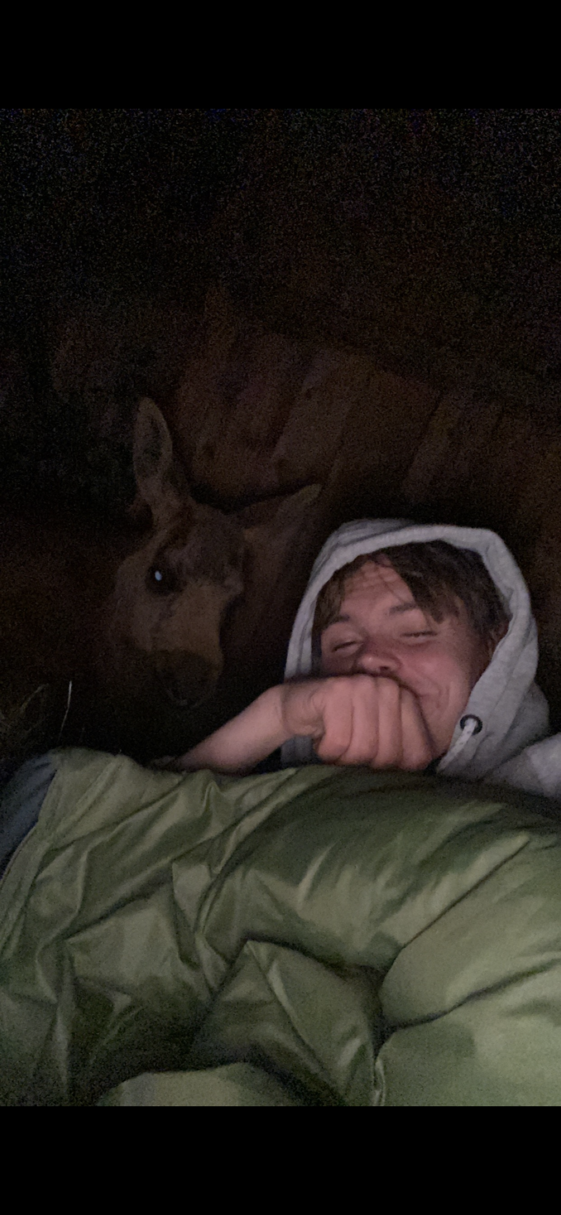 Elgkalven som «elget» seg inn på geitene, fikk sove side om side med menneske og har elghund som fostermor!