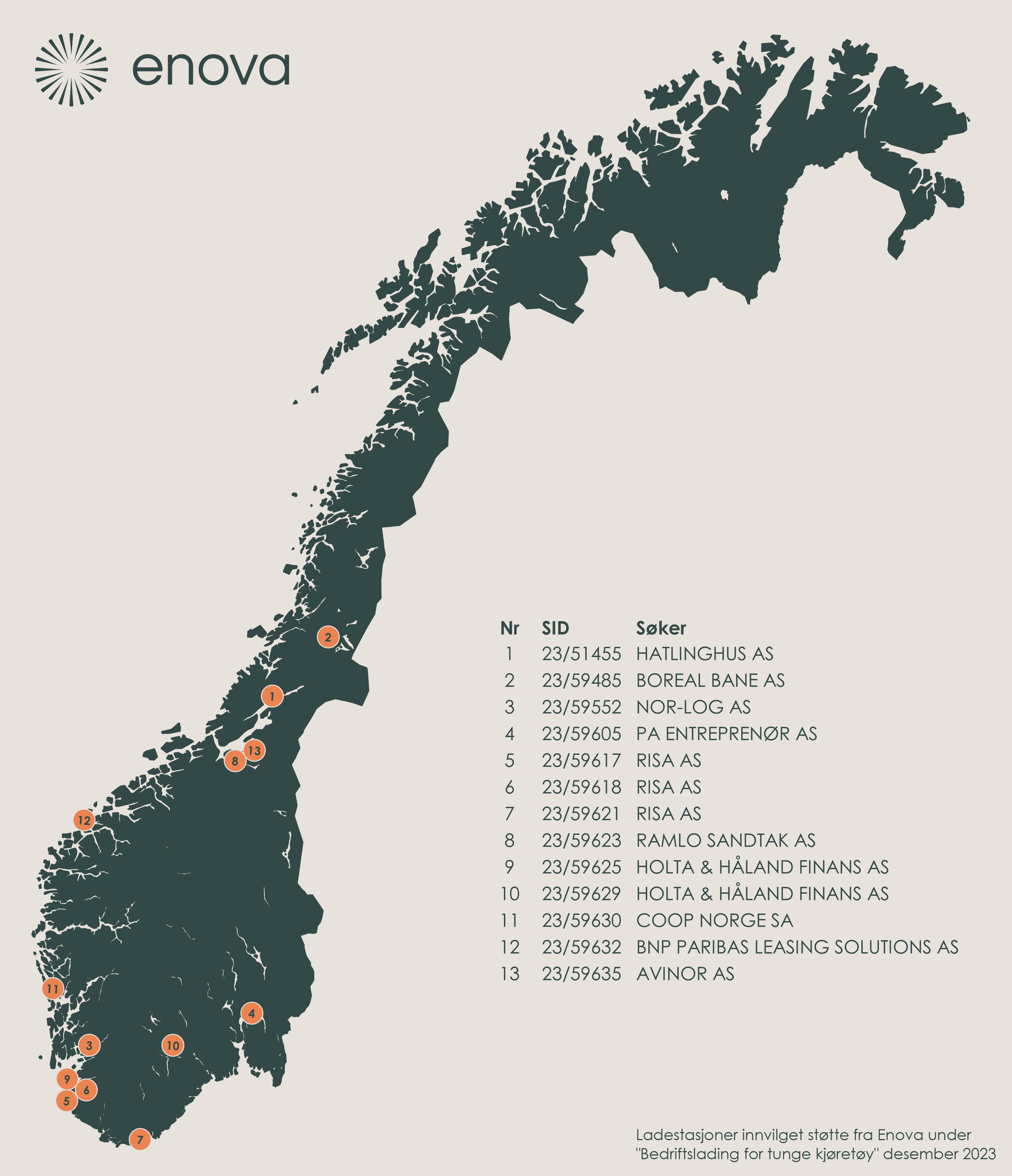 13 prosjekter får i alt 18 millioner kroner i Enovastøtte for å bygge ladestasjoner for tunge kjøretøy. Dette er fjerde runde med konkurranse for dette støtteprogrammet. Ladestasjonene skal være ferdig utbygd og i drift i før sommeren 2025.