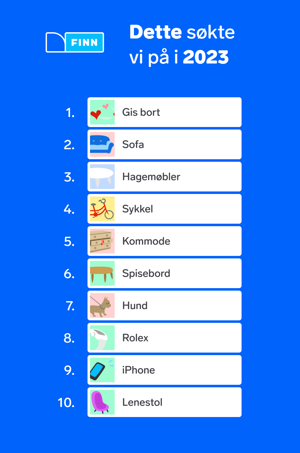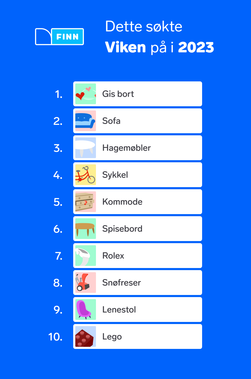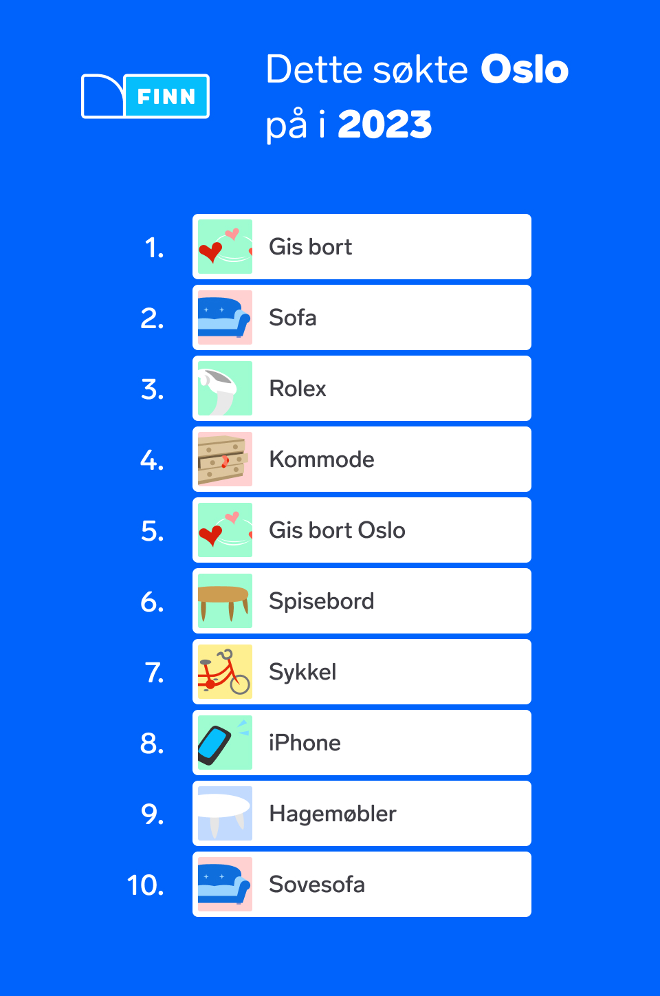 Dette året har vært preget av en negativ økonomisk utvikling for de fleste norske husholdninger og det har gjort utslag i søkeordene på FINN. For første gang i historien er søkeordet gis bort på førsteplass og dermed er sofa dyttet ned på andreplass. Rolex, som er en luksusvare, kryper også nedover på listen for hvert år.