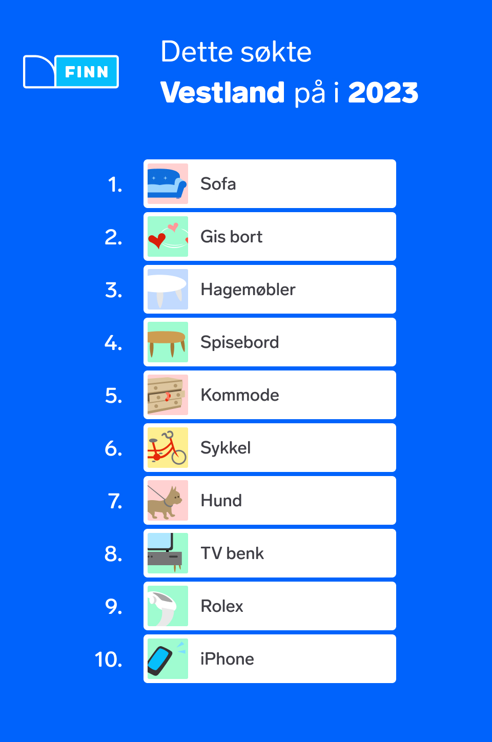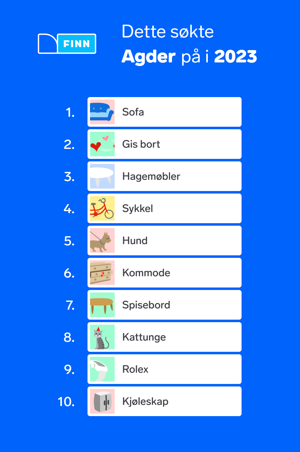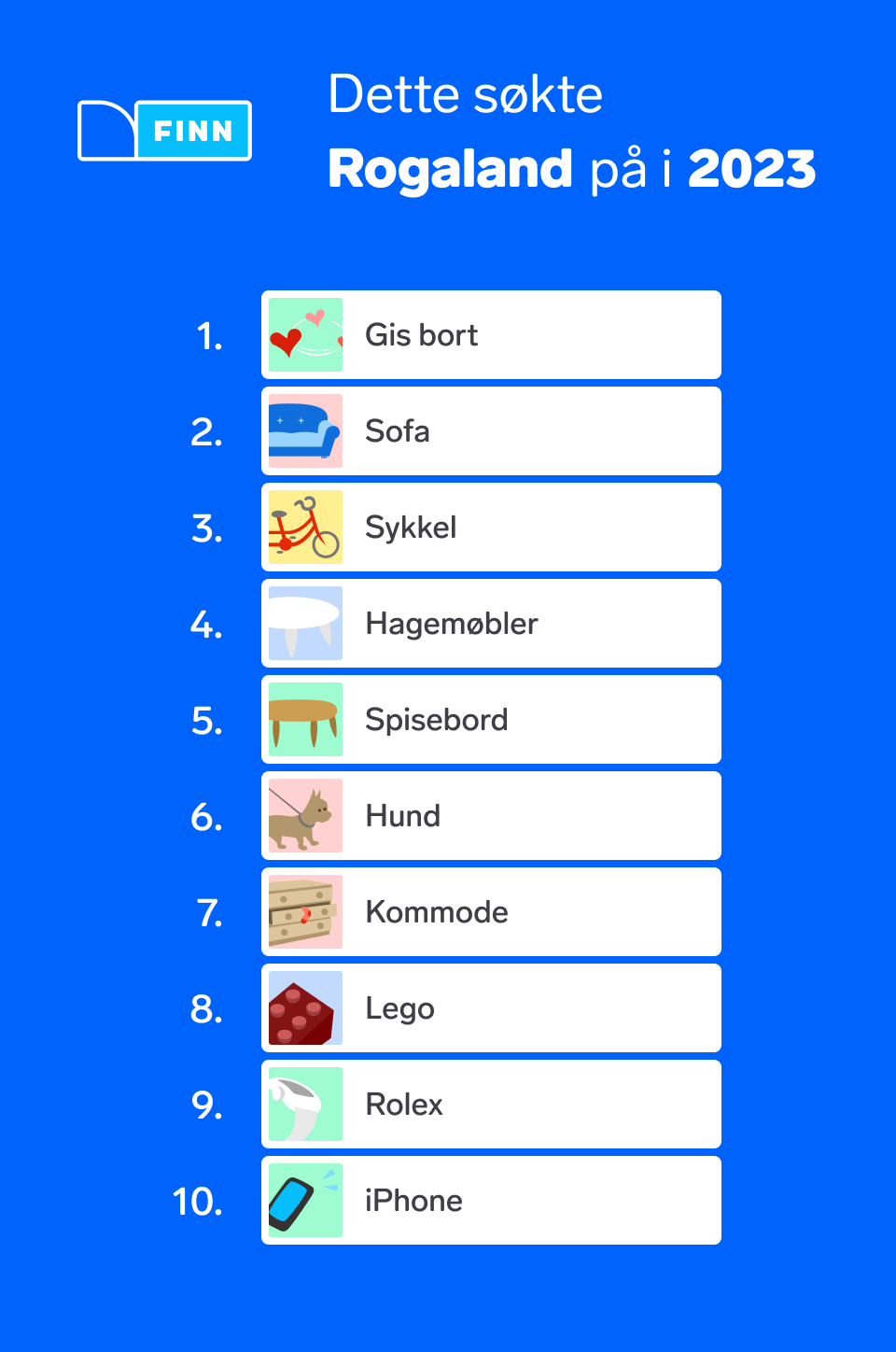 Dette året har vært preget av en negativ økonomisk utvikling for de fleste norske husholdninger og det har gjort utslag i søkeordene på FINN. For første gang i historien er søkeordet gis bort på førsteplass og dermed er sofa dyttet ned på andreplass. Rolex, som er en luksusvare, kryper også nedover på listen for hvert år.