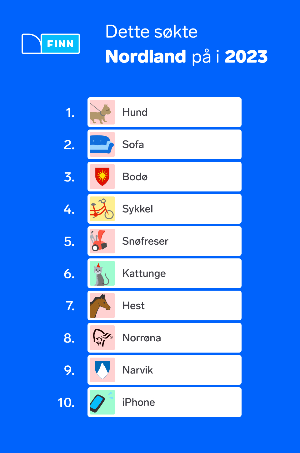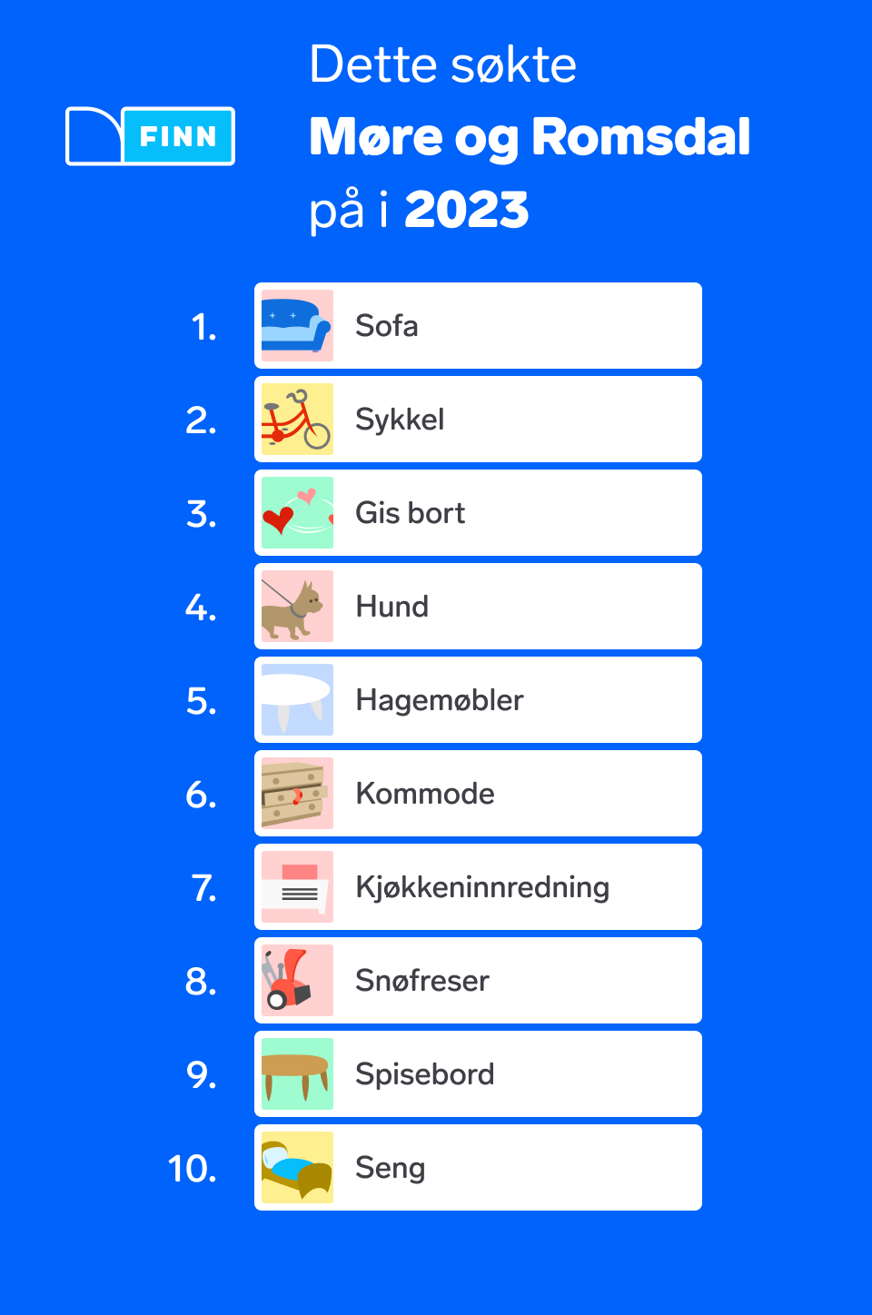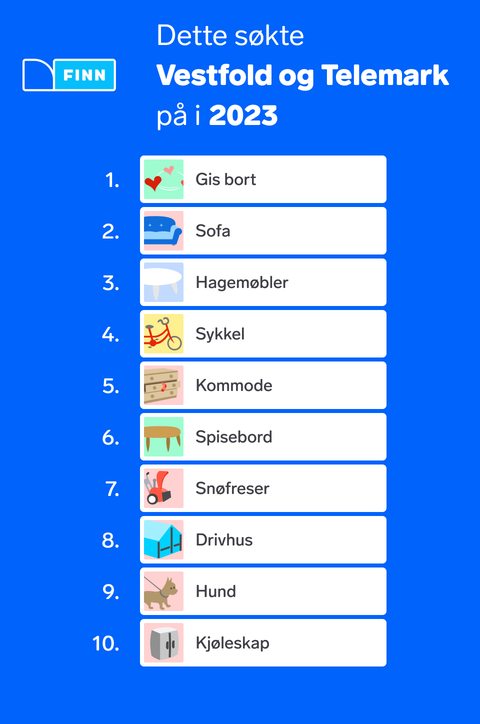 - Et kuriøst funn er at i Nordland og i Innlandet virker befolkningen mer opptatt av dyr, da både hund, katt og hest er kommet inn på topplisten i år over mest brukte søk. I fylker som fortsatt har sofa på førsteplass, ser vi også at antall søk på gis bort har økt kraftig, som for eksempel i Trøndelag der antall søk har gått opp fra 50 000 til 78 000 på ett år, forteller Opshaug Bakke.