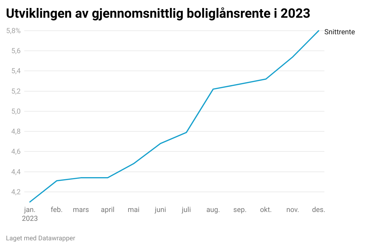 Etter syv renteøkninger fra Norges Bank i 2023, har gjennomsnittlig boliglånsrente økt fra 4,10 % i starten av året til 5,80 % nå i desember. Det viser data fra forbrukertjenesten Renteradar. Et gjennomsnittlig boliglån på 3,2 millioner har med andre ord blitt 4 500 kroner dyrere i måneden. Inkluderes siste renteøkning som blir effektuert i februar er det ytterligere 1300 kroner ekstra i måneden med en rente på 6 %.