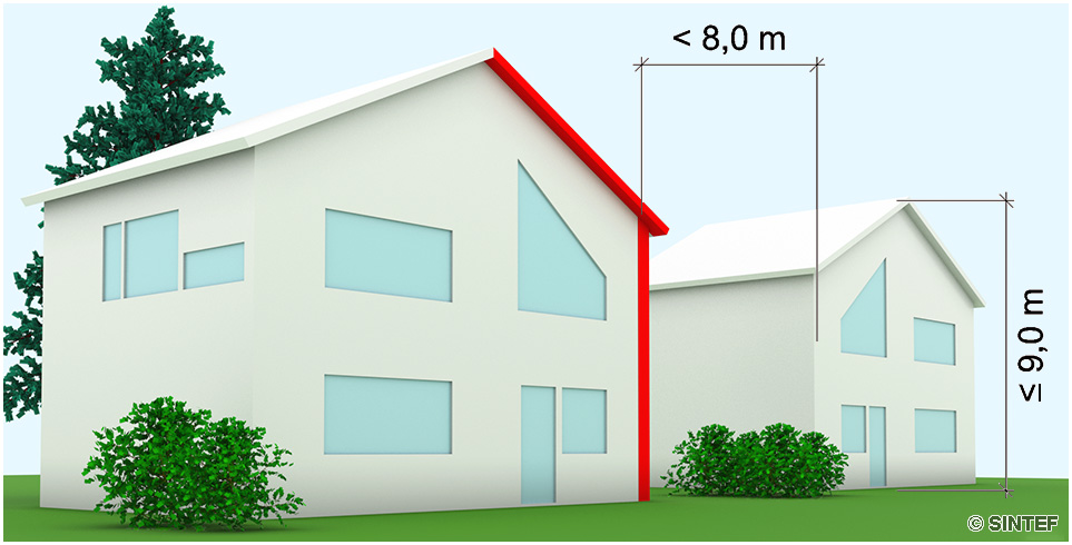 Det er behov for branncellebegrensende bygningsdeler mellom bygg med gesims- eller mønehøyde inntil 9,0 m og som ligger nærmere enn 8,0 m til bygning i annen bruksenhet, for eksempel frittliggende enebolig og kjede- eller rekkehus. Ill.: SINTEF
