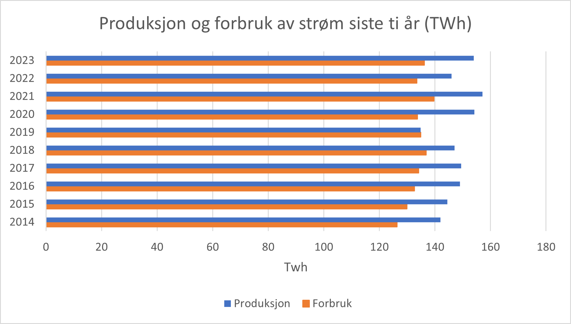 Nøkkeltall kraftåret 2023 Produksjon: 154 TWh Forbruk 136,1 TWh Utveksling av strøm: Import 13,1 TWh Eksport 30,9 TWh Nettoutveksling 17,9 TWh (avrundet) |