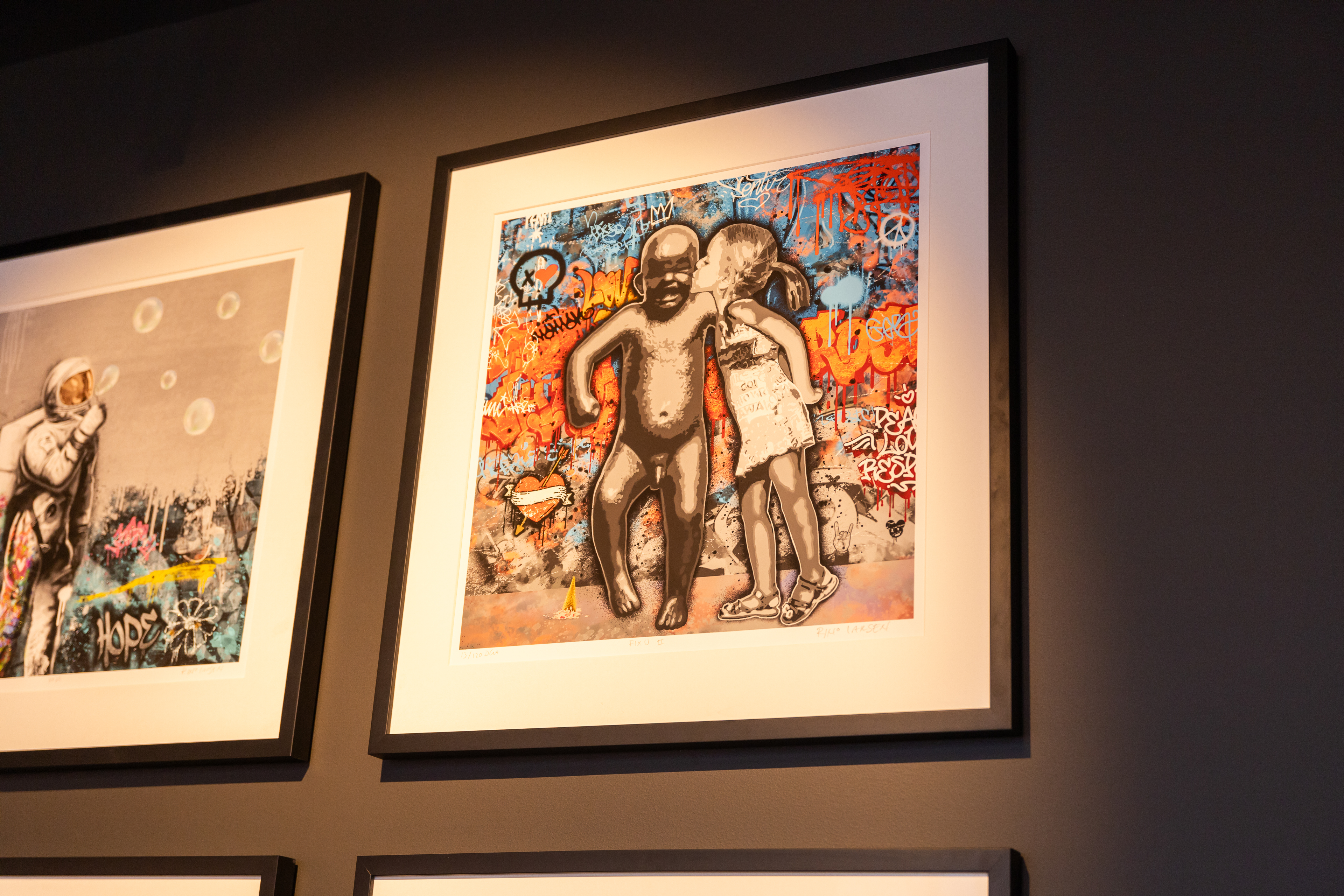 Fra åpningsdatoen vil kunstverk av Rino Larsen være på utstilling i lokalet. Disse er ikke bare til stede for kundenes beundring, men også til salgs gjennom QR-koder plassert ved de energiske og fargerike bildene.