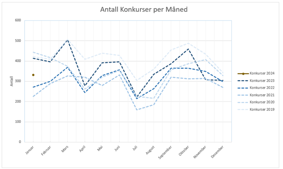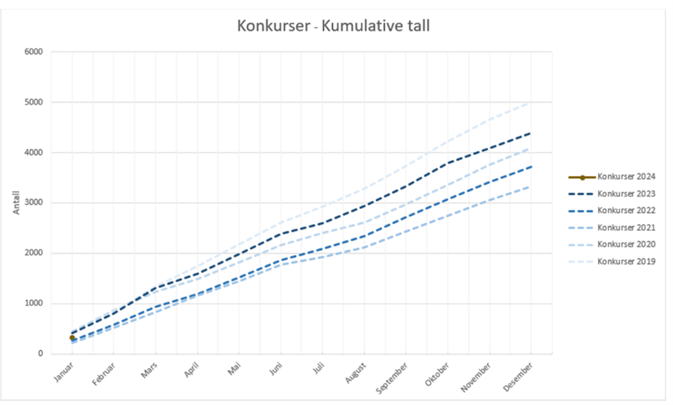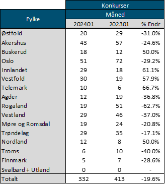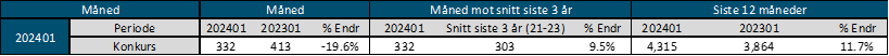 332 bedrifter ble erklært konkurs i januar. Sammenlignet med 413 bedrifter i januar 2023 er det en reduksjon på 20 prosent. Ser man på statistikken i lengre linjer, er konkurstallene for januar 10 prosent høyere enn snittet de siste tre årene. De siste 12 månedene har 4 315 bedrifter gått konkurs, sammenlignet med 3 864 på samme tidspunkt i fjor, som tilsvarer en 12 prosent økning. Dette peker mot en sannsynlig økning i konkursene i de kommende månedene, selv om årets første måned hadde nedgang i forhold til fjoråret.