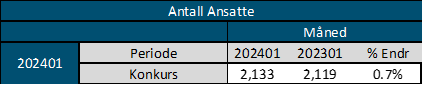 Til tross for at konkurstallene er lavere enn forventet på tvers av bransjer, er antall ansatte som er påvirket av konkurser tilnærmet likt samme periode i fjor. I januar 2023 var det 2 119 ansatte som mistet jobben på grunn av konkurs, januar i år var det samme tallet 2 133 – en økning på én prosent. Dette betyr at det er færre, men større bedrifter som nå har gått konkurs.