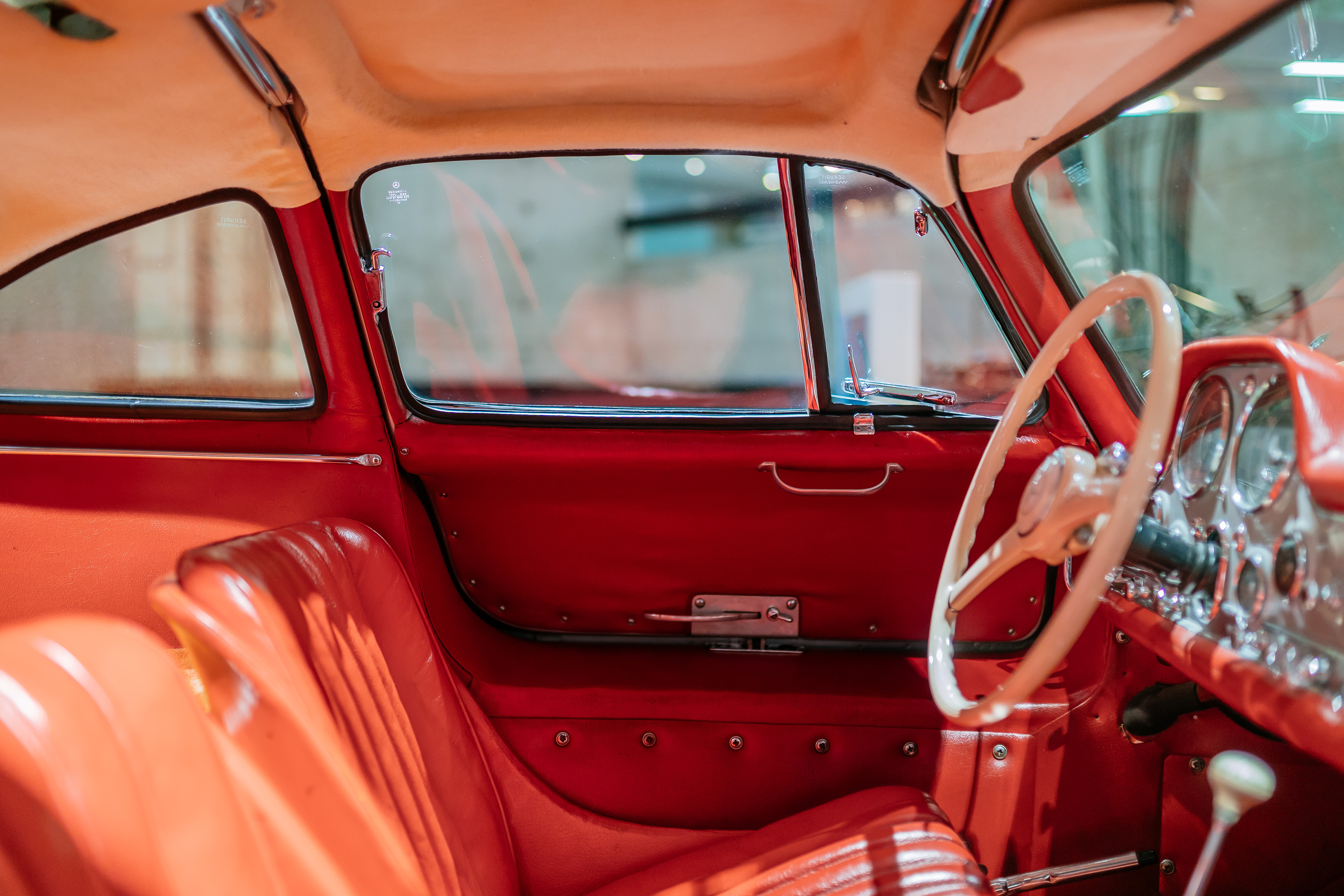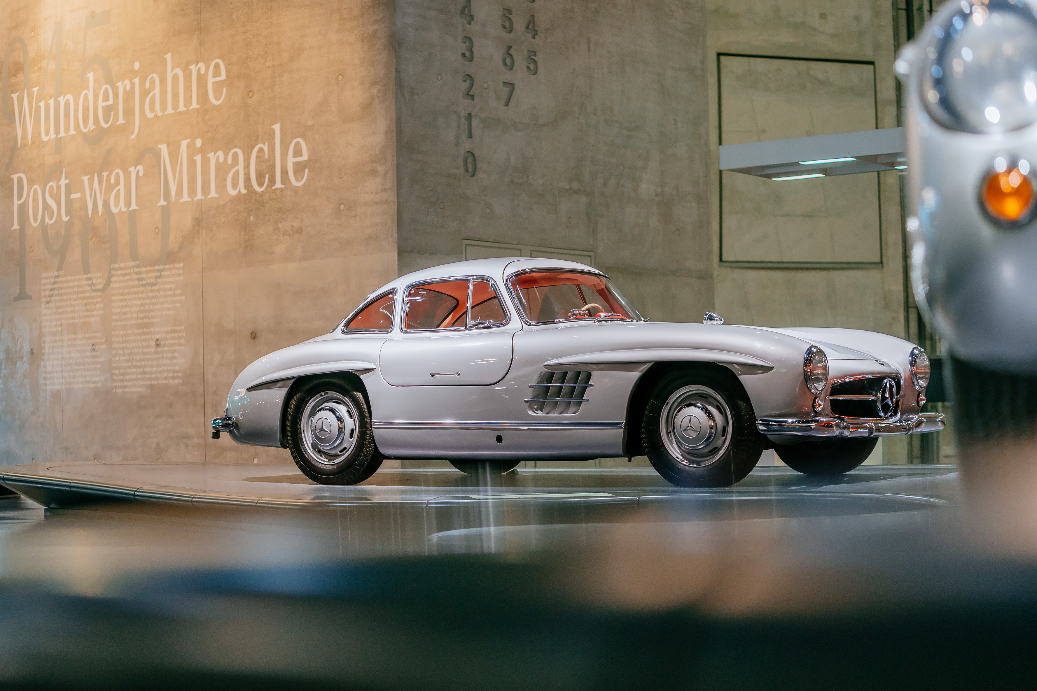 På Mercedes-Benz museet i Stuttgart i Tyskland står en sølvfarget Mercedes-Benz 300 SL Coupé med rødt interiør utstilt, der den tiltrekker seg mye oppmerksomhet fra de besøkende.