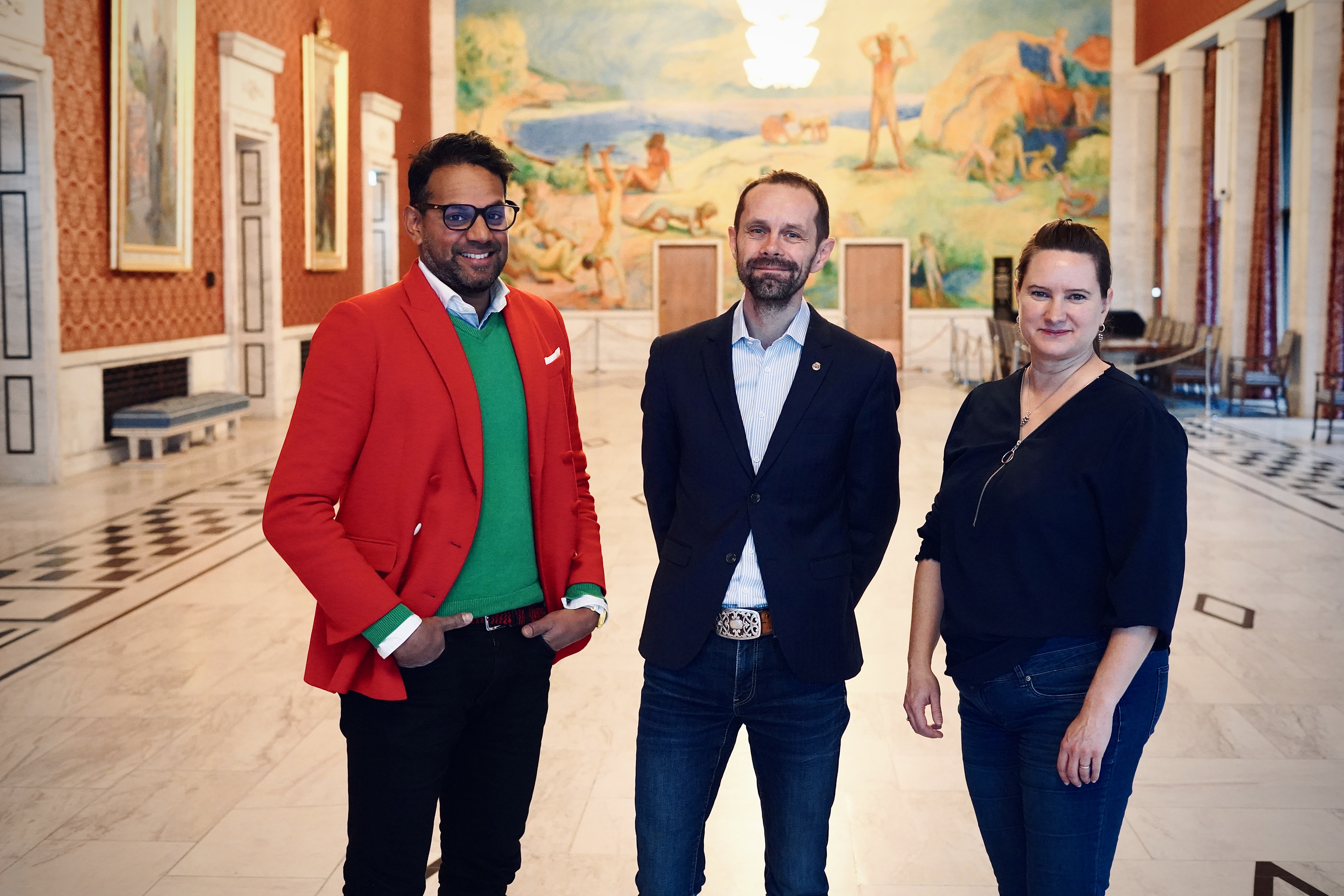 På bildet: F.v. Tobias Studer Andersson, leder i Sopra Steria Scale up, finansbyråd Hallstein Bjercke (V) og Loopfronts kommersielle leder Taru Holm.