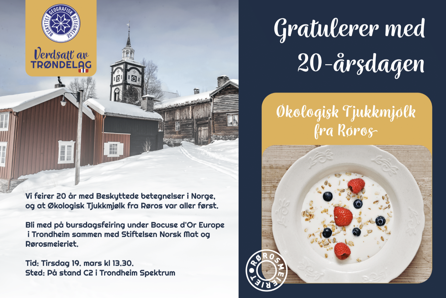 Landbruks- og matminister Geir Pollestad hyllet merkeordningen Beskyttede betegnelser på 20-årsdagen. - Det er en ære å gratulere de som har vært en del av denne utrolige reisen. En spesiell takk går til Rørosmeieriet og «Økologisk Tjukkmjølk fra Røros», pioneren fra 2004, sa Pollestad på Kokke-EMs åpningsdag i Trondheim.