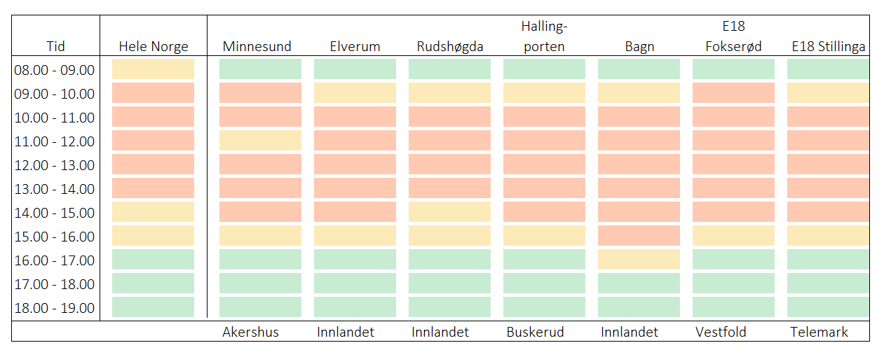 – Så er trafikken på sitt aller travleste mellom klokken 10.00 og 11.00, med unntak av Hallingporten og E18 Stillinga. Der er det mest trafikk mellom klokken 11.00 og 12.00. Det er uansett formiddagen som er mest travel, så styr unna denne, råder Skovly.