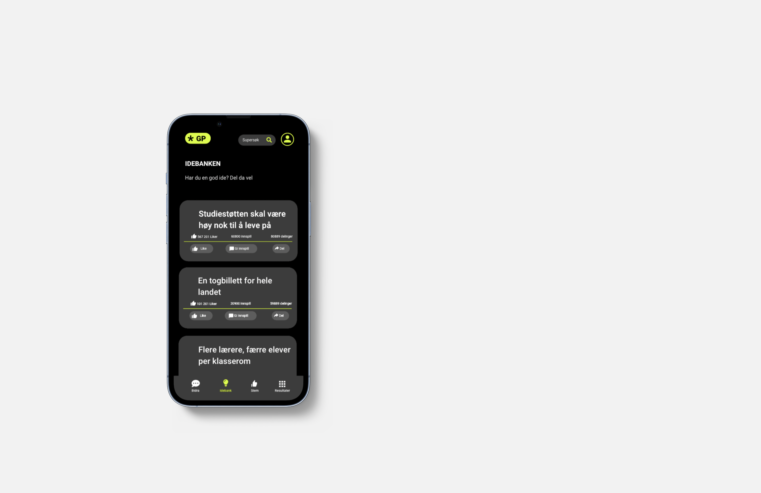 Norge står i dag ovenfor en stor utfordring med økende polarisering. GP har laget en samlende løsning som gir hver enkelt direkte innflytelse samtidig som den sikrer mot useriøse og uetiske forslag. GP slipper i dag en prototype av plattformen som er basert på AI og menneskelige kvalitets mekanismer. Denne gir tilgang til å stemme på saker, komme med forslag og ideer som skal videreutvikles. Dette gir også store muligheter for forskningsmiljøer, ideeklynger og næringsliv.