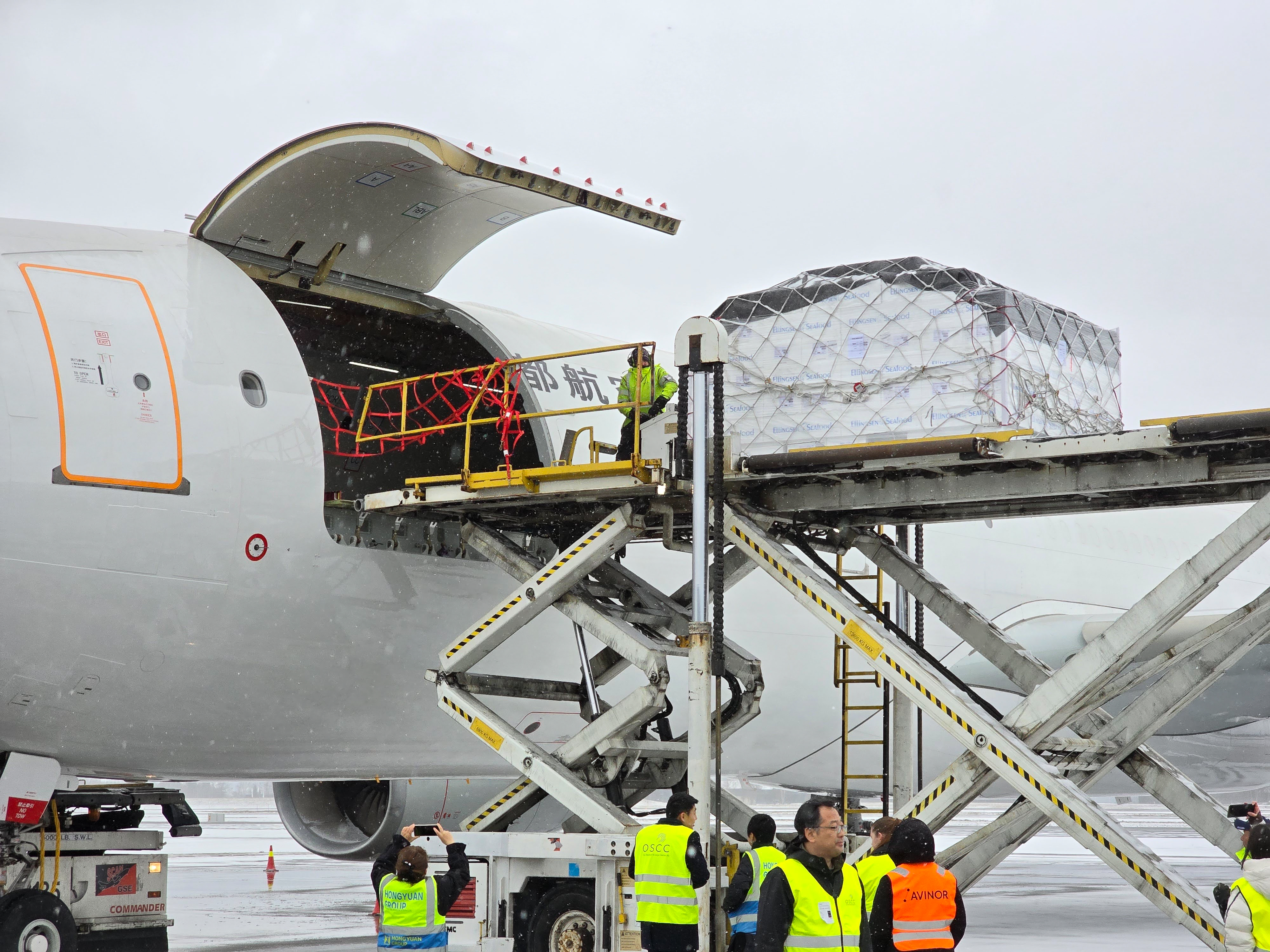 210 tonn fersk fisk skal flys direkte til det kinesiske markedet fra Oslo lufthavn hver uke. Denne uken landet det første fraktflyet fra Hongyuan Group.