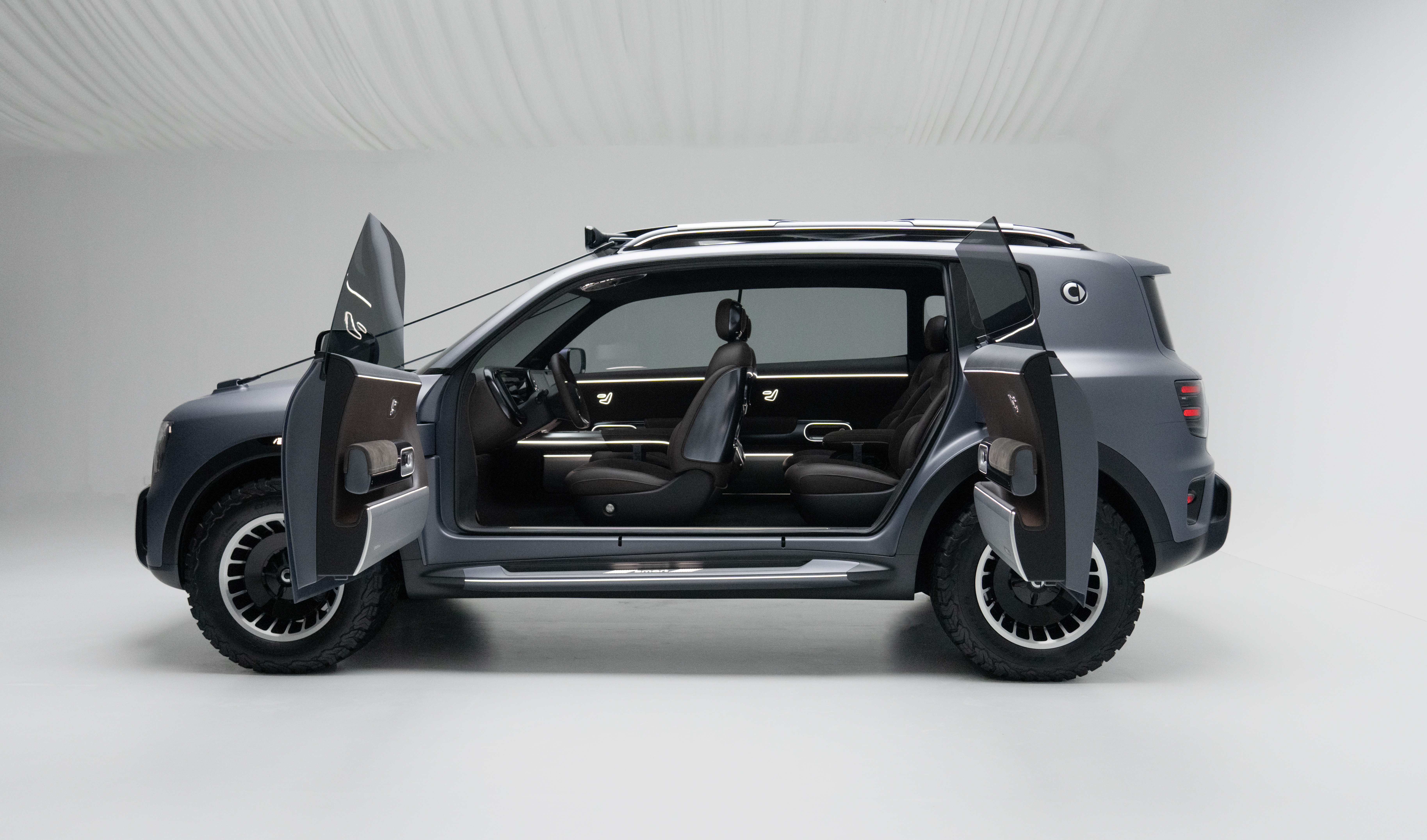 De beskyttende platene foran og bak, med en skjult integrert vinsj og et sammenleggbart trinn bak som gir tilgang til taket, tydeliggjør bilens karakter. Konseptbilen imponerer også når det kommer til størrelse ettersom overhengene både foran og bak er usedvanlig korte.