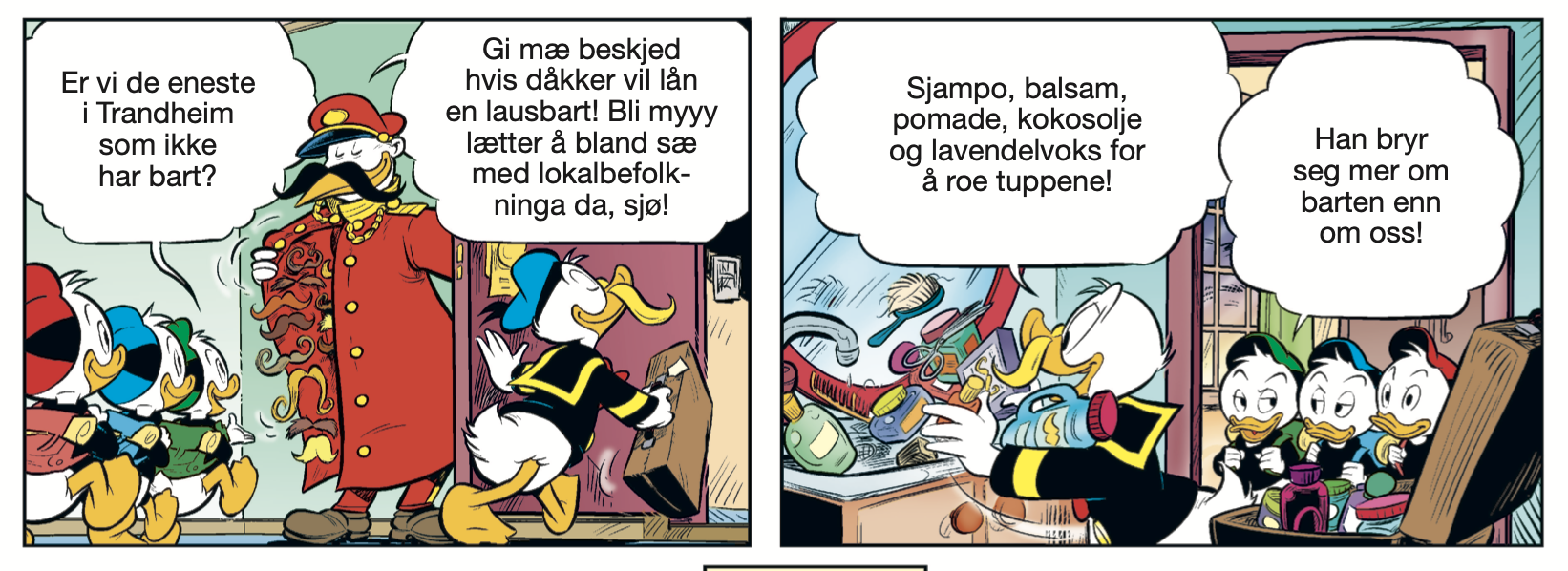 I Donald Duck & Co 17 som utkommer 26. april besøker Donald Trondheim (Trandheim) for å være med i Det store mustasjemesterskapet! Historien er oversatt til trøndersk ved komiker og programleder Klaus Sonstad.