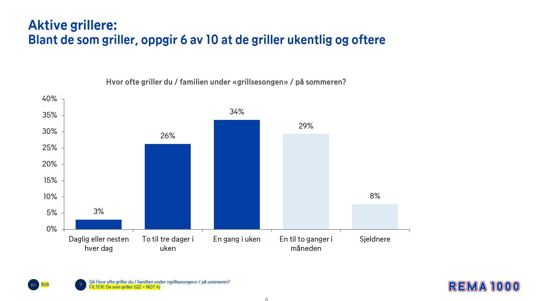 Nå som grillsesongen er i gang vil seks av ti grille én eller flere ganger i uken, viser en fersk grillundersøkelse utført av Opinion, på vegne av REMA 1000. - Kundene elsker å grille, og da må vi være på vårt aller beste gjennom hele grillsesongen, sier Pia Mellbye, Salgs- og Markedsdirektør i REMA 1000, som allerede opplever en knallbra start på grillsesongen.