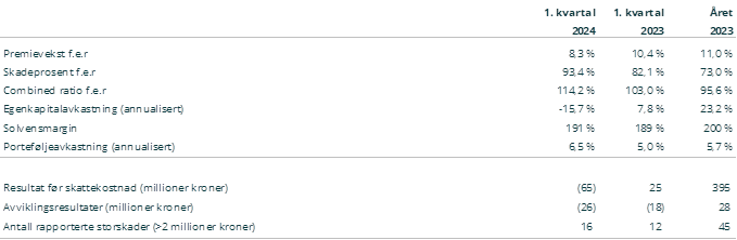 Selskapet leverer i første kvartal et resultat før skatt på -65 millioner kroner (25). Skadeprosent for egen regning i kvartalet var 93,4 (82,1) Selskapet opplever god vekst i premieinntektene i kvartalet, men mer frekvensskader og storskader sammenlignet med samme periode i fjor, noe som bidrar til et svakt teknisk resultat i kvartalet.