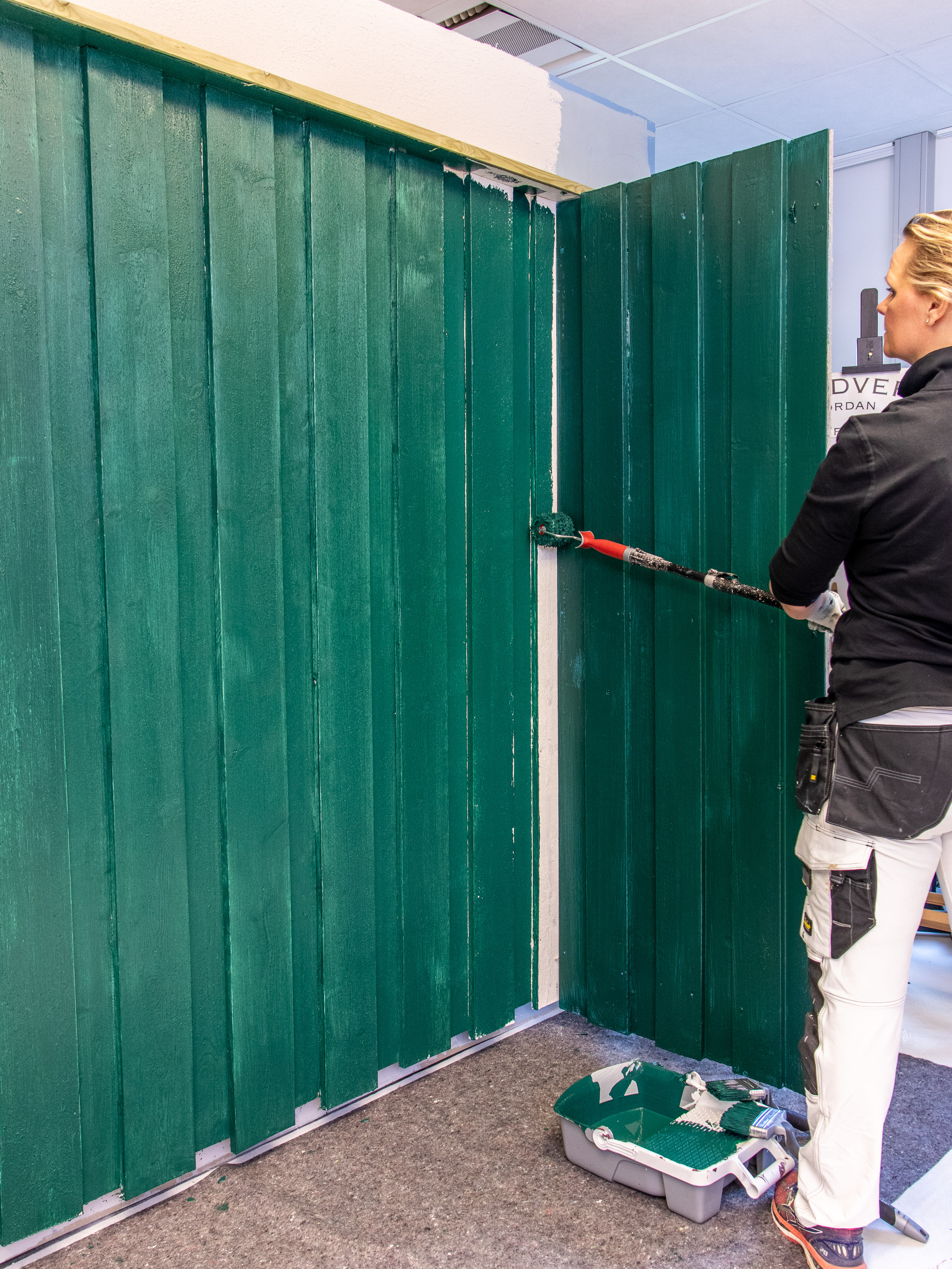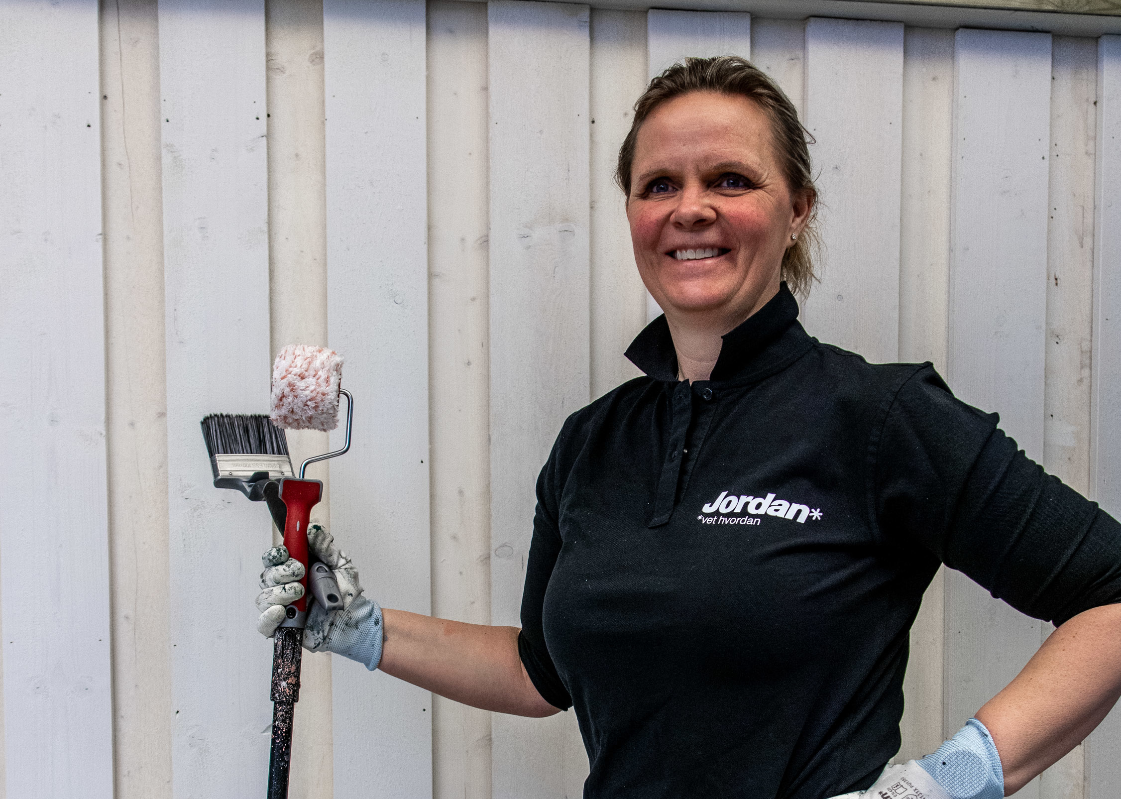Til penselpåføringen valgte Schaanning framgangsmetoden de fleste hjemmefiksere sverger til – størst mulige pensel, holdt i hånden. Det ble brukt en flat pensel på 120mm som tar opp mye maling, og en oval 65mm pensel med vinklet skaft. Hun var også nøye med å male endeved nederst på veggen, og spare ut mot en tilstøtende konstruksjon øverst.