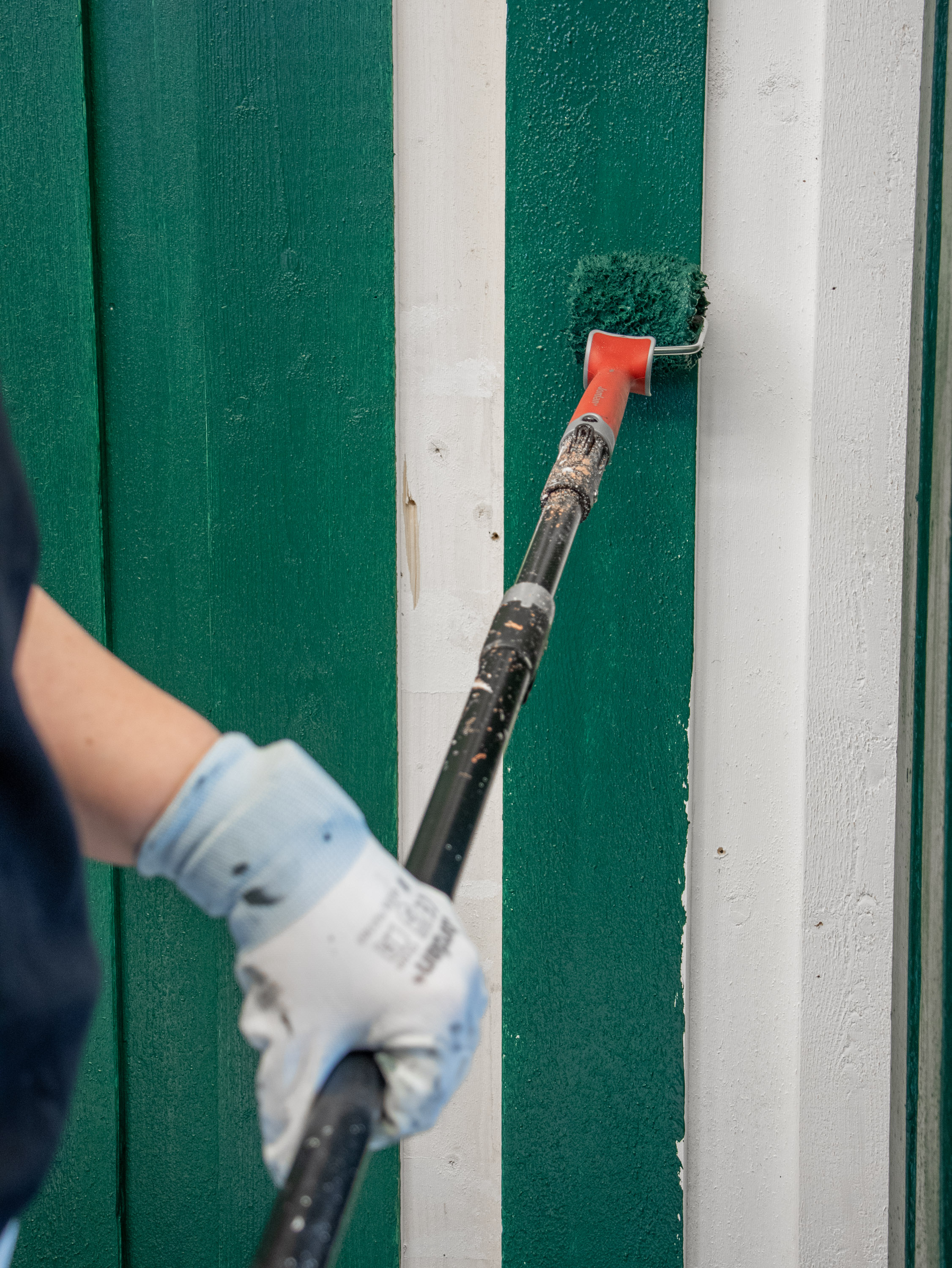 – Her er det viktig å få på nok maling på rullen før du starter. Dypp den godt i maling, og rull den frem og tilbake i rullebrettet flere ganger for å sikre at malingen er jevnt fordelt på rullen. Rullen skal så rulles over kledningen i lange trekk opp og ned. Det er viktig å ikke gni rullen, og du skal dyppe den ofte i malingen. Du skal ikke male med tørr rull, sier hun.