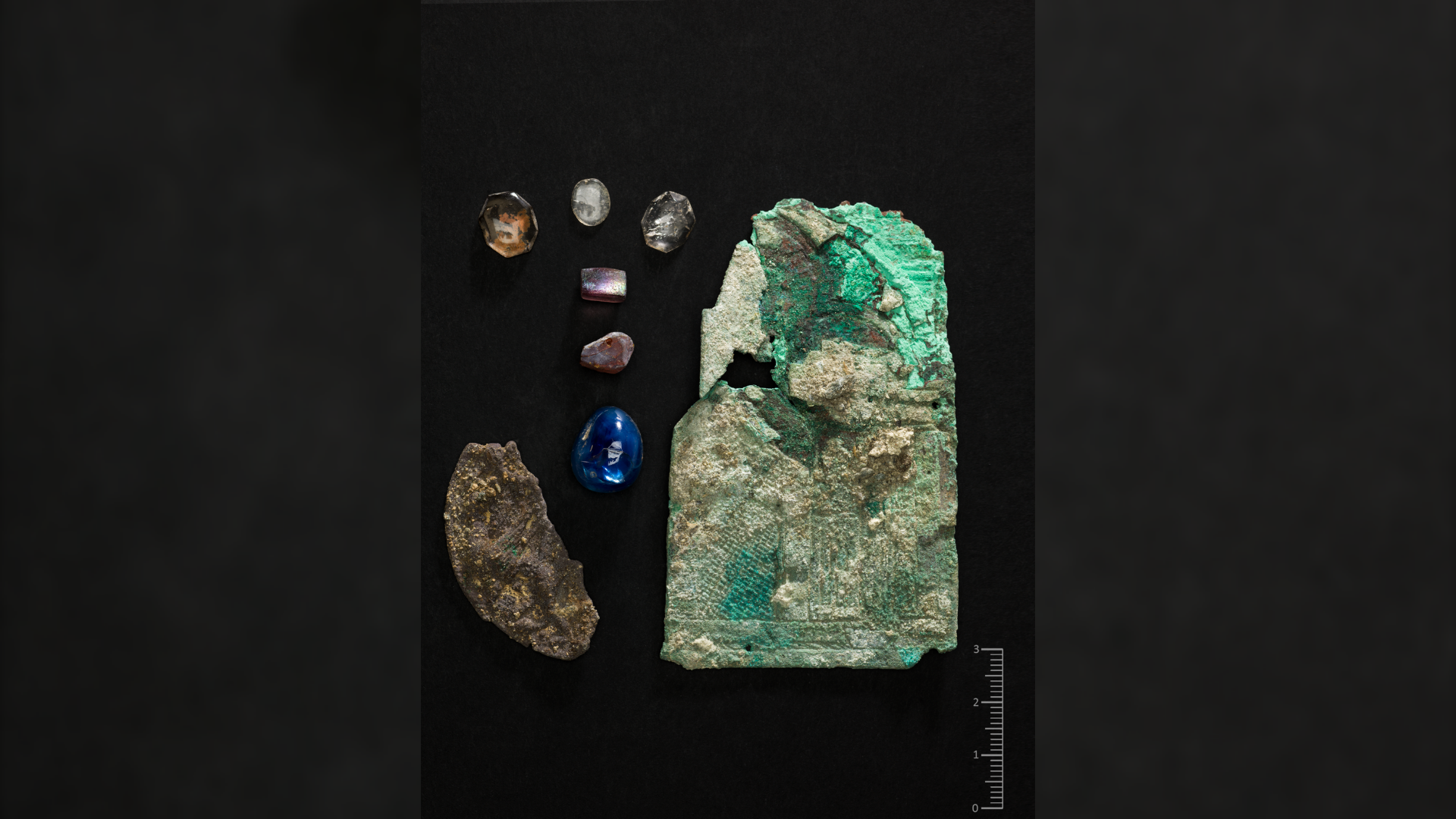 Funnet består av en forgylt kobberplate på fem ganger ti centimeter med små hull langs kantene som tyder på at den har vært festet til en større gjenstand, for eksempel en treplate. Dette ser arkeologene i sammenheng med en forgylt sølvmedaljong med dyremotiv, og flere dekorative edelsteiner av glass.