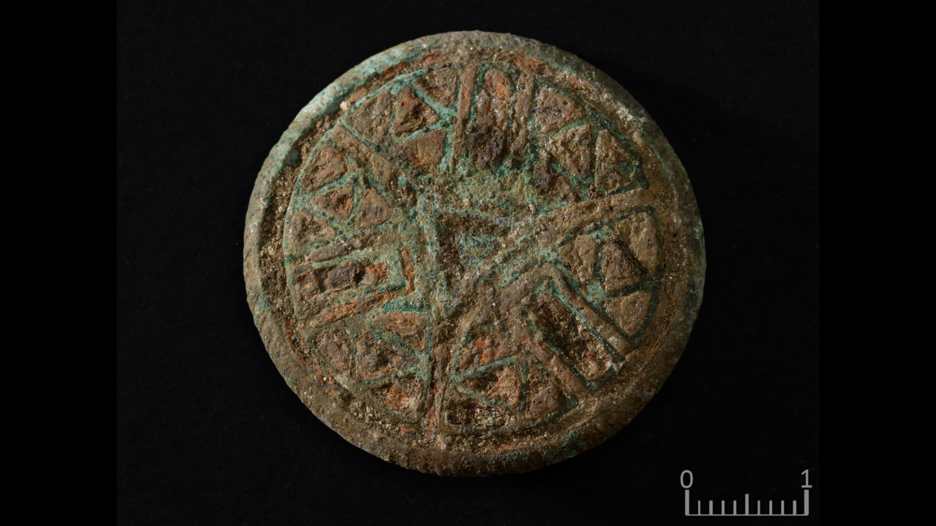 Et vakkert emaljert beslag med detaljert geometrisk mønster. Beslaget er typisk metallarbeid fra de britiske øyene i sen vikingtid og viser at Stavanger hadde gode handelsnettverk allerede da.