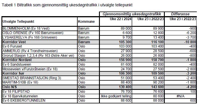 I korridor Vest* er trafikknivået inn til Oslo redusert med 10800 biler per dag. I korridor Nordøst** er reduksjonen på 1800 biler mens i korridor Sør*** er biltrafikken redusert med 3200 biler.