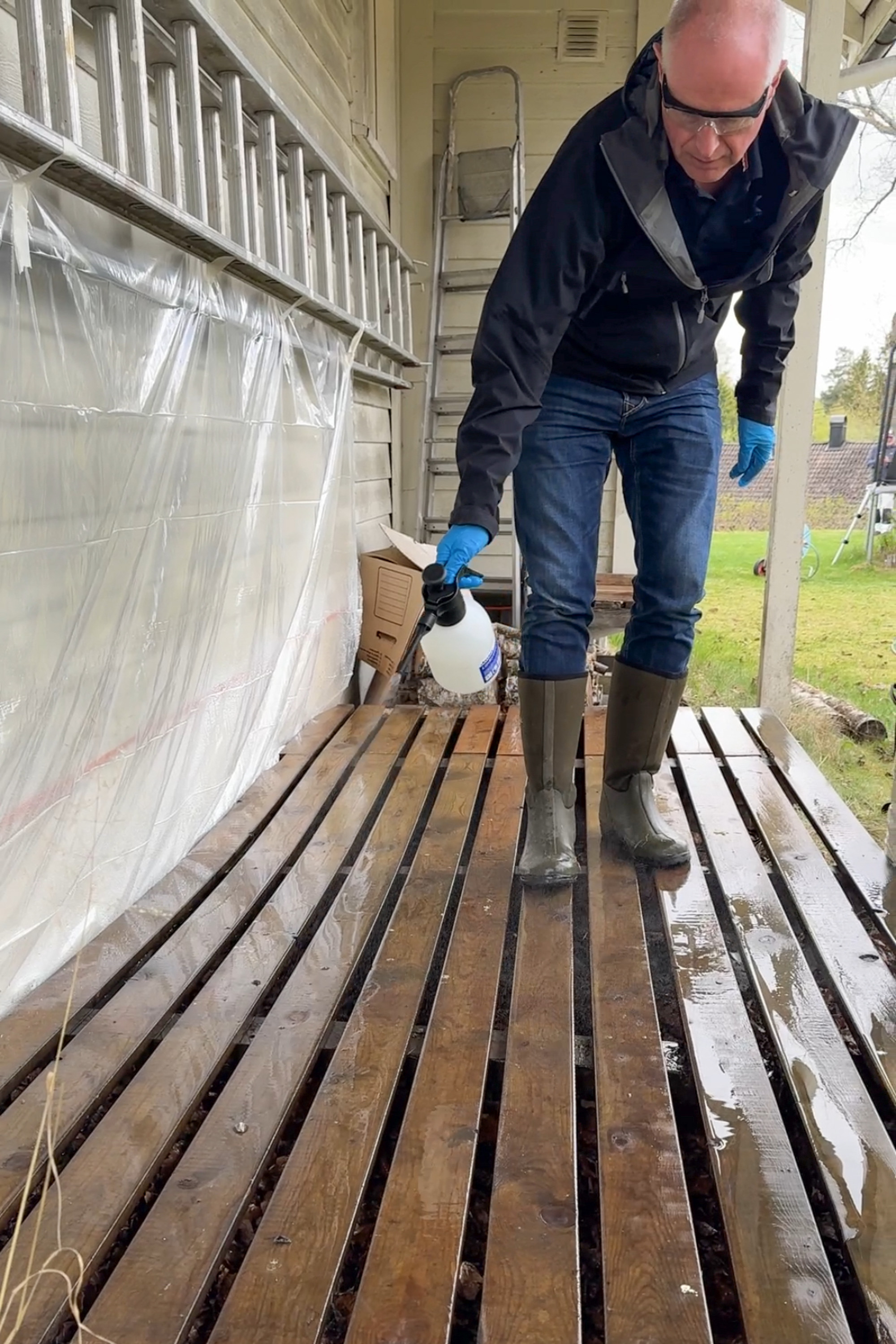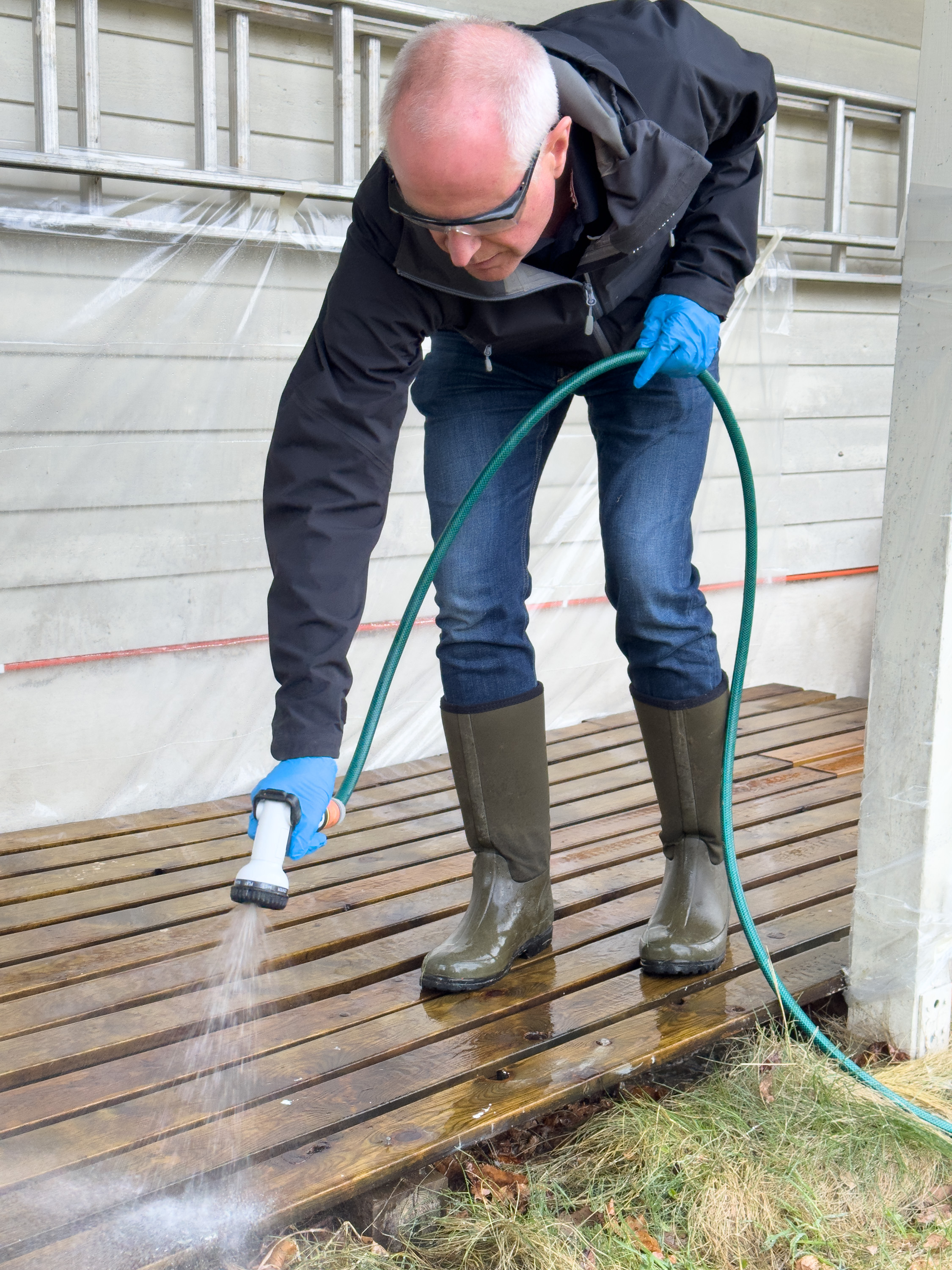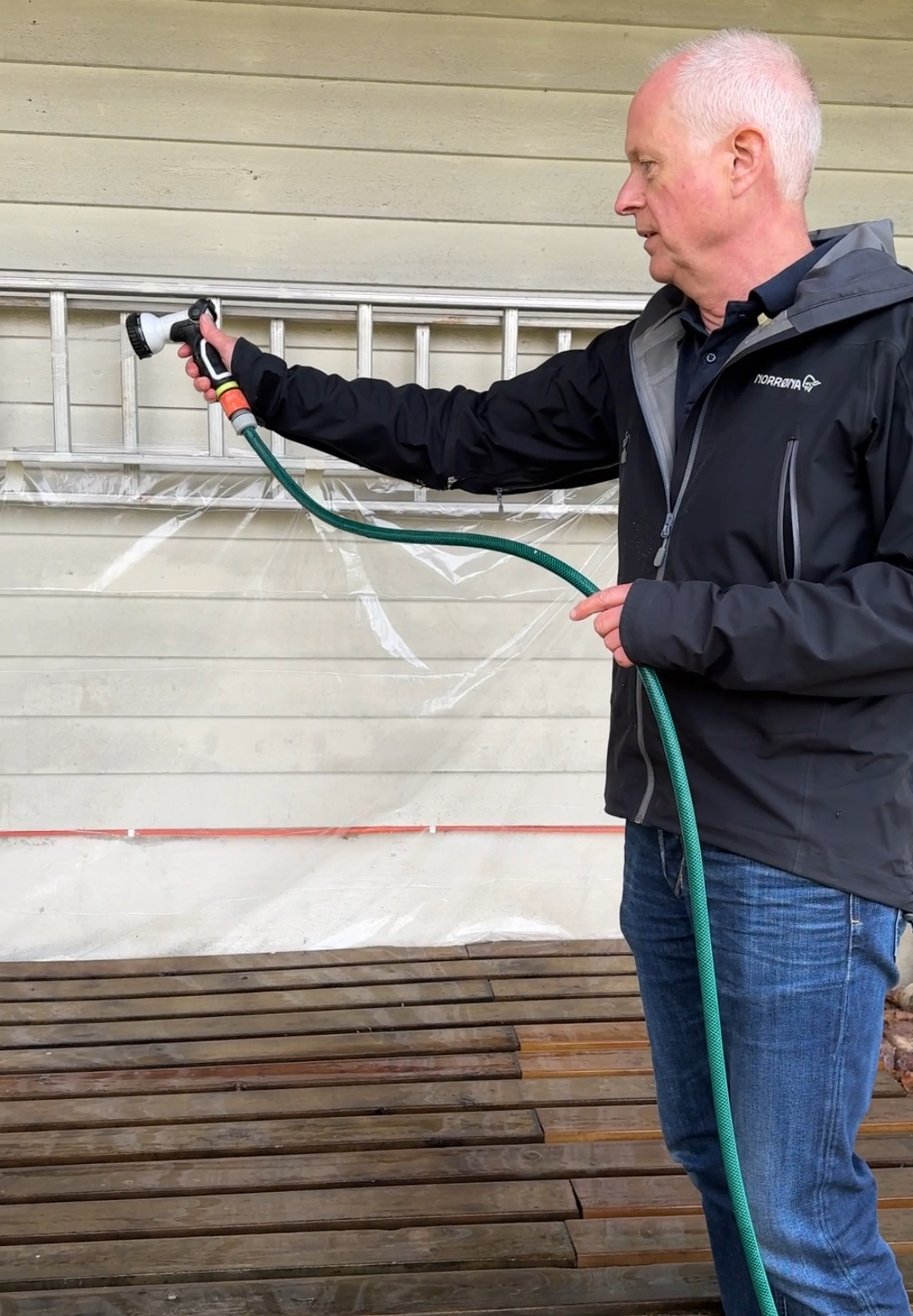 Det ideellet været for terrassevask er overskyet og lett duskregn, for da unngår du at rengjøringsmiddelet tørker før du får satt i gang med skrubbingen. Hvis terrassen ikke er våt fra før, så bruker du en hageslange og forfukter treverket.