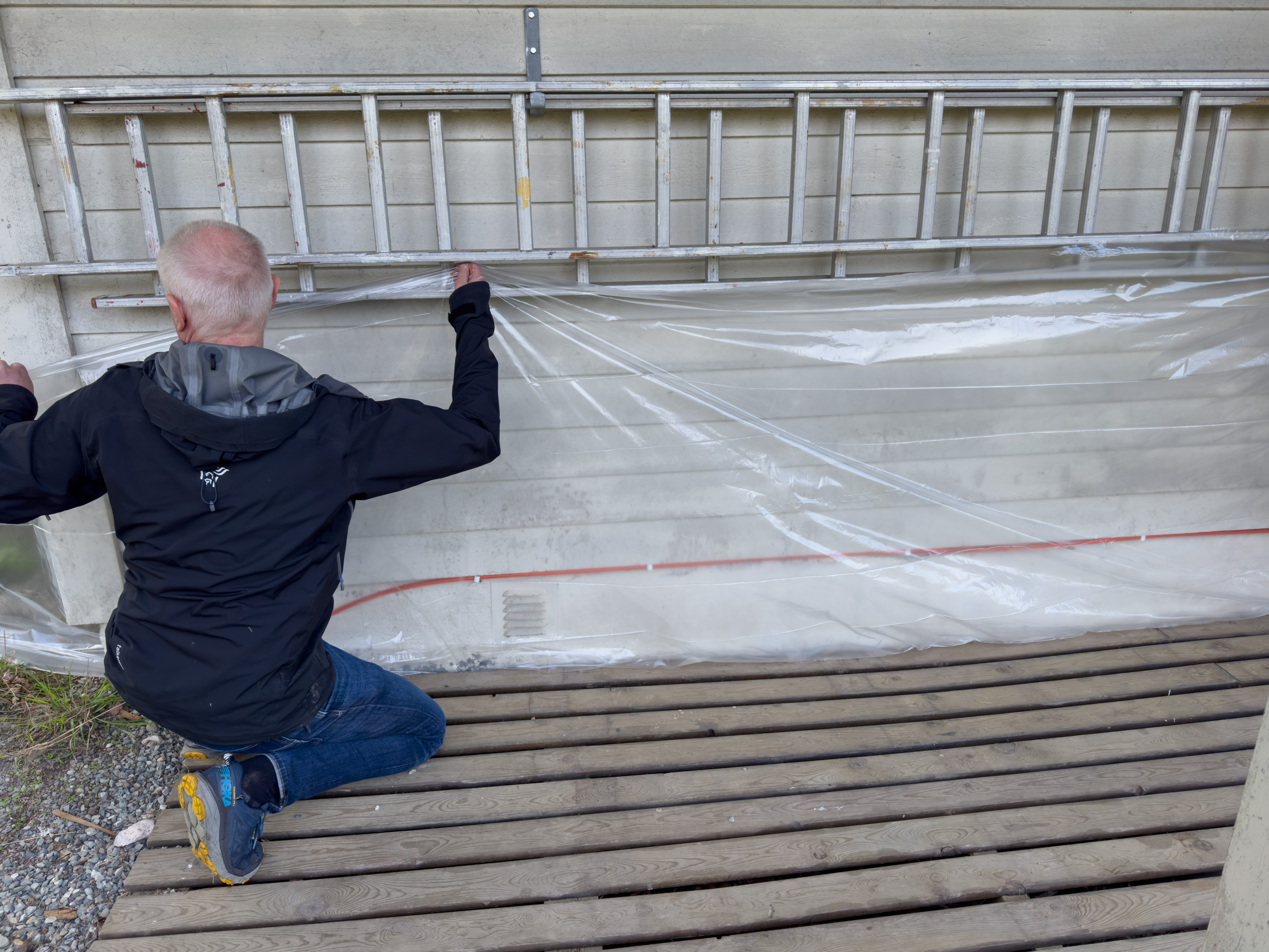 Rydd hele overflaten som skal vaskes, og dekk til blomsterbed som ikke skal få såpe på seg. Ved bruk av sterke kjemikalier finner du alltid anbefalt verneutstyr i bruksanvisningen. Ved bruk av terrasserens er det også smart å dekke til fasade som står i nærheten av terrassen eller plattingen som skal vaskes, så du ikke skader malingen der ved et uhell.